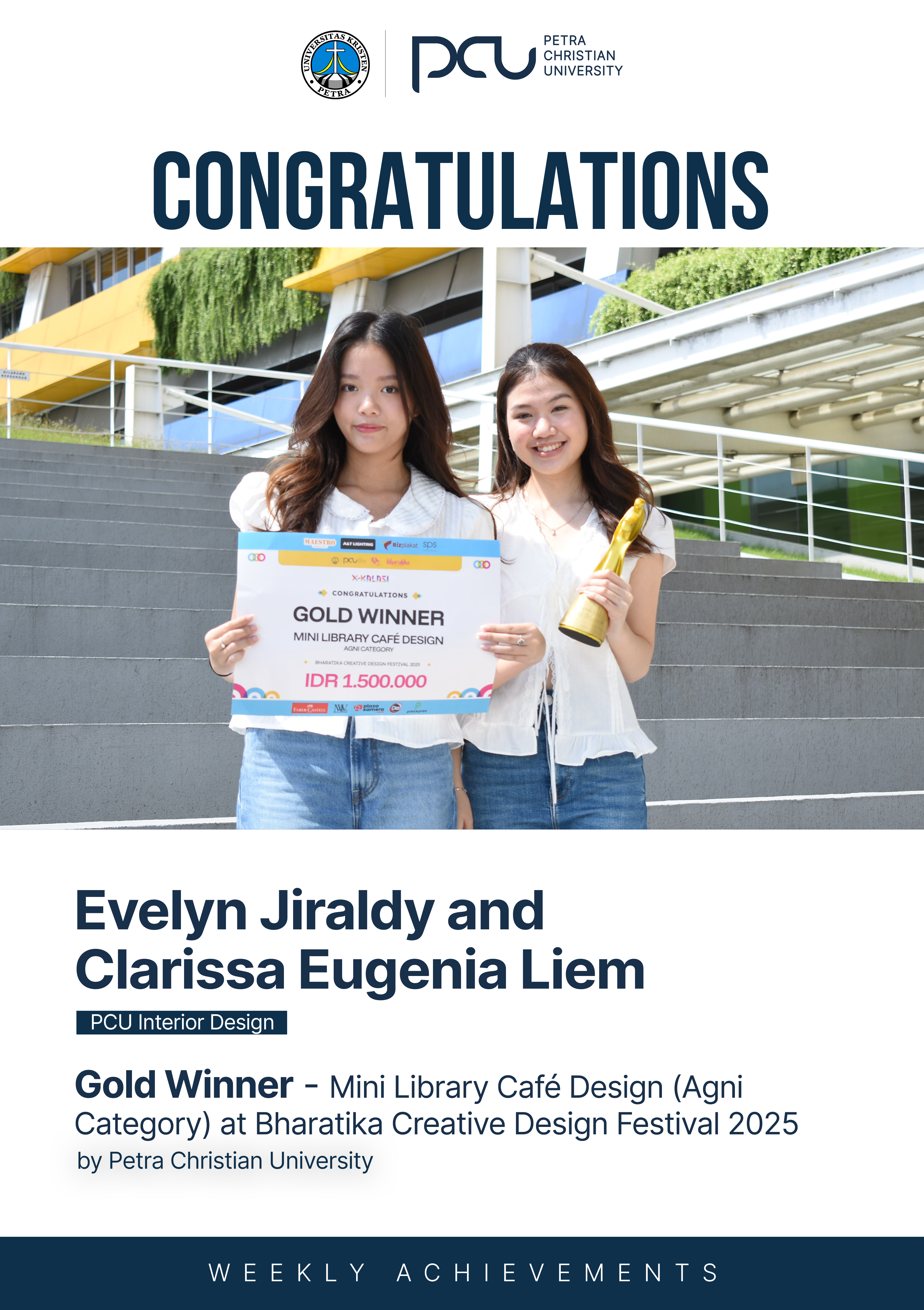 Selamat atas prestasi yang diraih Evelyn Jiraldy, Clarissa Eugenia Lim sebagai Gold Winner dalam Mini Library Cafe Design (Agni Category) at Bharatika Creative Design Festival 2025 by Petra Christian University