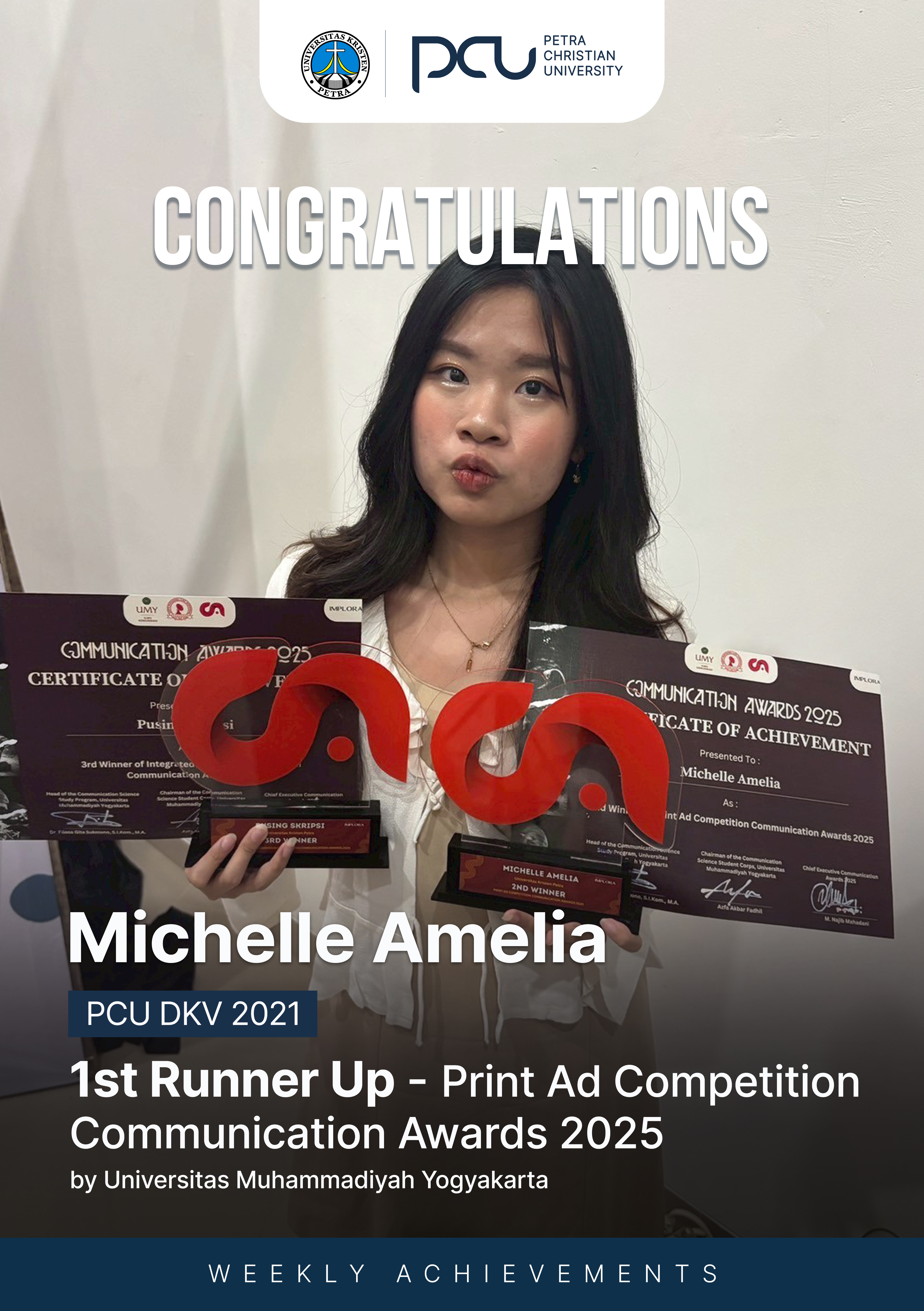 Selamat atas prestasi yang diraih Michelle Amelia sebagai 1st Runner Up dalam Print ad Competition Communication Awards 2025 by Universitas Muhammadiyah Yogyakarta