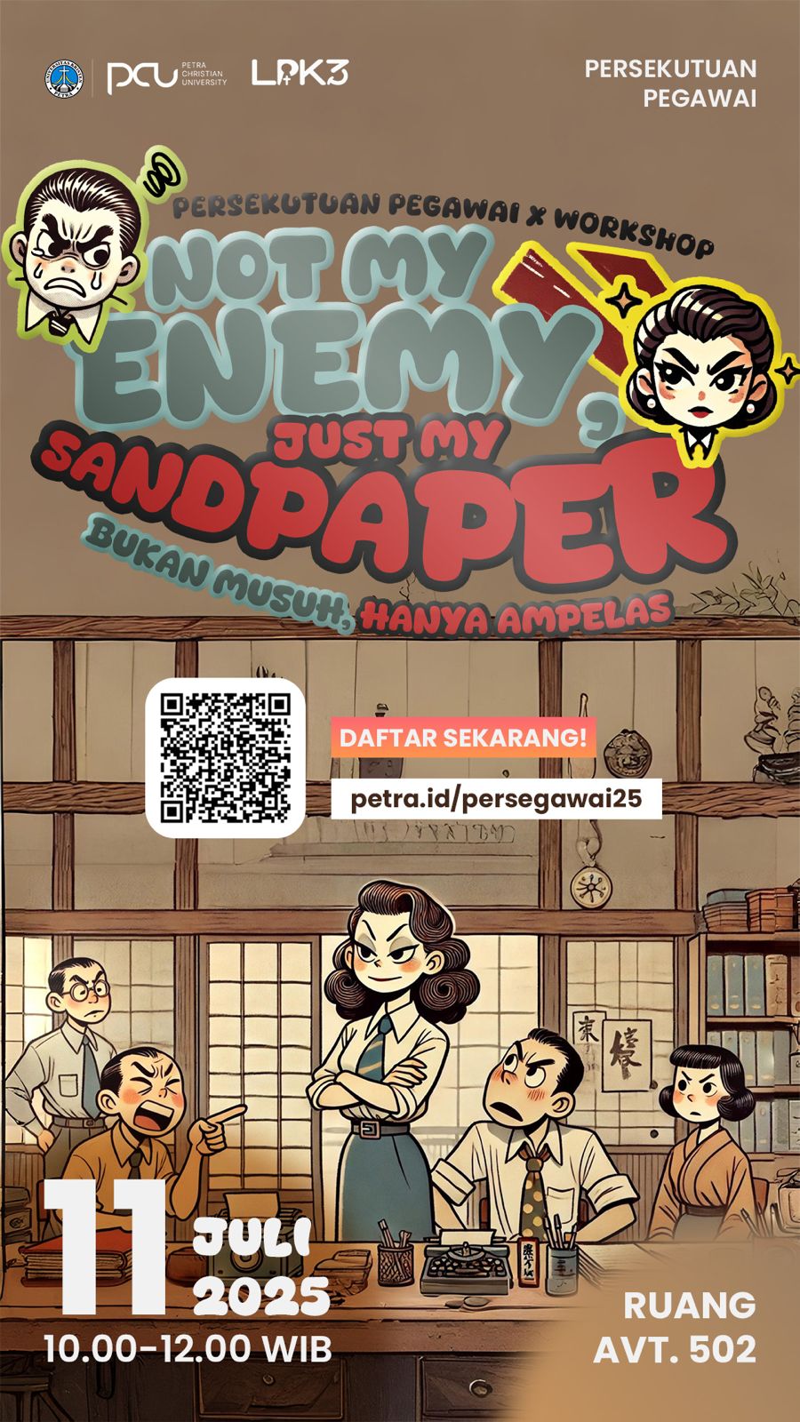Pada tanggal 11 Juli 2025 jam 10.00-12.00 WIB bertempat di AV.T.502, Pusat Kerohanian UK Petra mengundang seluruh Staf Kependidikan dan Dosen UK Petra untuk hadir dalam Persekutuan Pegawai 2025. Dengan mengangkat tema Not My Enemy Just My Sandpaper.