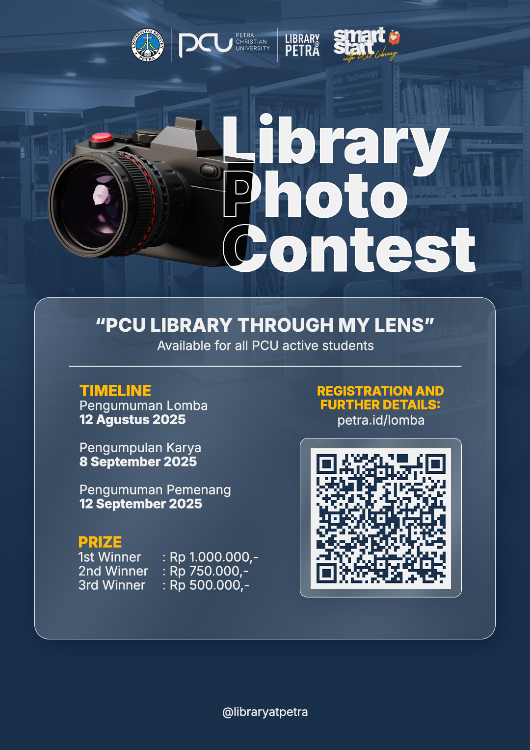 Perpustakaan Universitas Kristen Petra mengadakan kompetisi fotografi tentang Perpustakaan UK Petra. Pengumpulan karya pada tanggal 08 September 2025 serta pengumuman pemenang pada tanggal 12 September 2025. Untuk info pendaftaran bisa dilihat di petra.id/lomba
