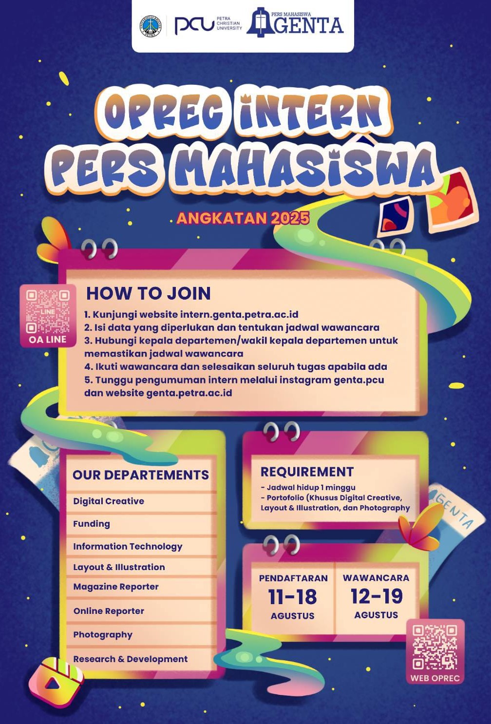 Open Recruitment Intern Pers Mahasiswa GENTA untuk mahasiswa angkatan 2025. Pendaftaran dibuka pada 11-18 Agustus 2025 dan wawancara pada 12-19 Agustus 2025.