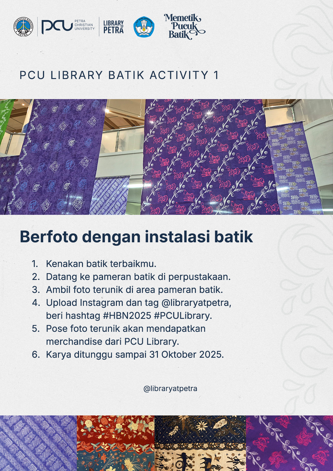 Kenakan kain atau kemeja batik, lalu abadikan momen di area pameran. Unggah hasil fotonya ke media sosial, tag akun Instagram @PCULibrary, dan sertakan tagar #HBN2025 #PCULibrary.