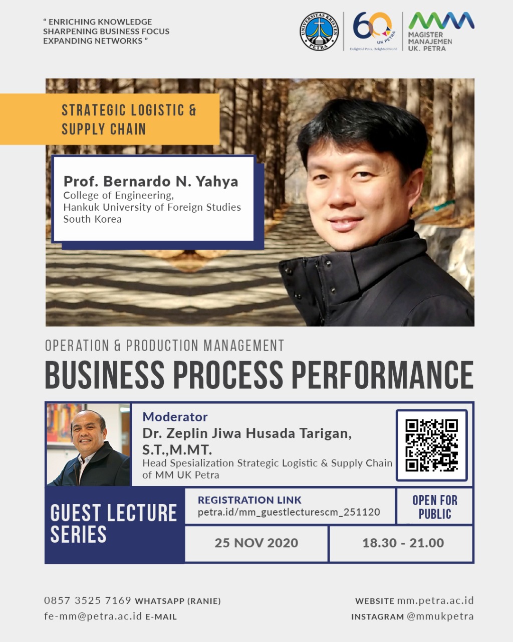 Program Studi Magister Manajemen UK Petra pada 25 November 2020 mengadakan Kuliah tamu strategic logistic and supply chain: "operation and production management, business process management". Dengan narasumber Prof. Bernardo N. Yahya dengan moderator Dr. Zeplin Jiwa Husada Tarigan.