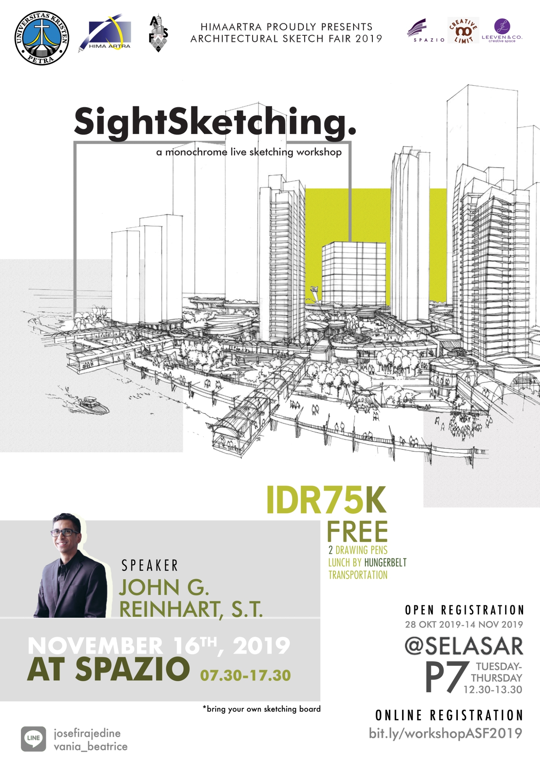 Program Studi Arsitektur UK Petra mengadakan workshop dengan tema "SightSketching". Pada tanggal 16 November 2019 bertempat di Spazio. Dengan narasumber John G. Reinhart, S.T. Untuk pendaftaran dibuka pada 28 Oktober 2019 hingga 14 November 2019. Dengan biaya pendaftaran 75 ribu Rupiah.