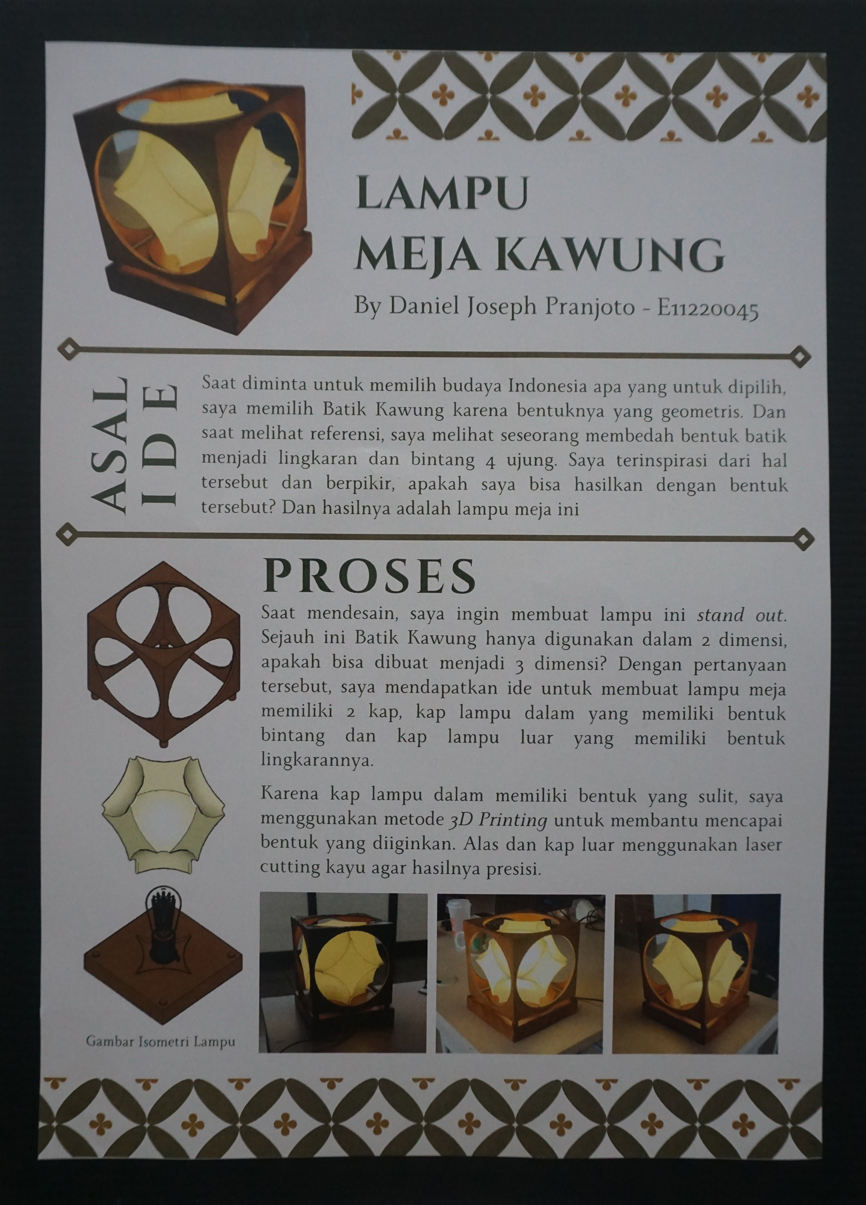 Dalam rangka menyemarakkan 27 tahun Prodi Desain Interior diselenggarakan seminar Insight bersama alumni dan pengguna lulusan, serta rangkaian acara IDE+ (Interior Design Exhibition and Workshop) 18-20 Juni 2025 yang menyajikan berbagai karya mata kuliah Personal Space, Presentasi Visual, Interior Design for Workspace, Furniture Design for Workspace, Interior Design for Cultural Space, Interior Product Design For Cultural Space, Craft and Furnishing, dan LEAP Final Project. Dalam pameran IDE+ tahun ini disajikan pula hasil karya kolaborasi project based learning Prodi Desain Interior PCU - UCSI dan UiTM. Salah satu materi pameran ini ialah Lampu Meja Kawung. Karya Daniel Joseph Pranjoto (E11220045)