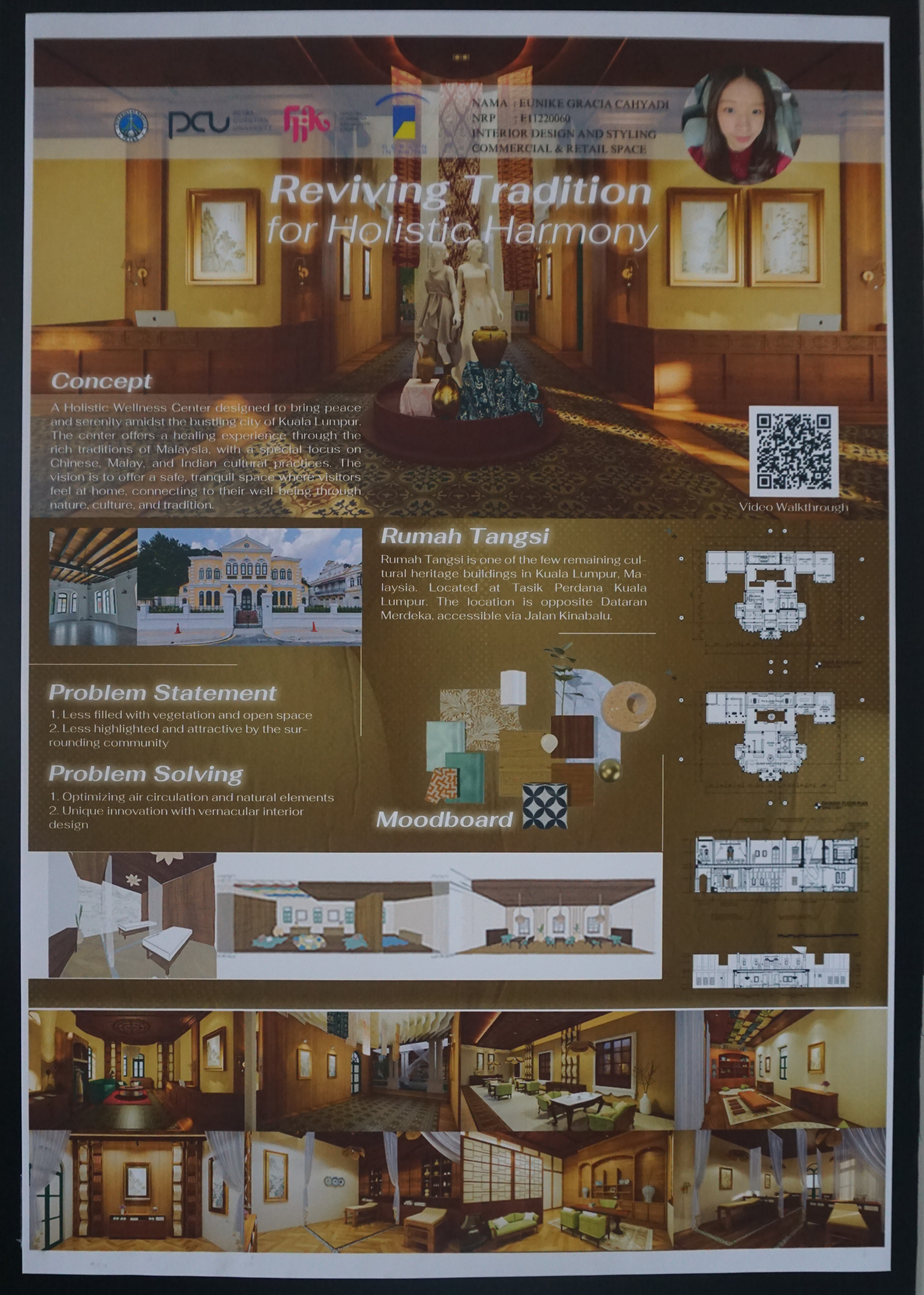 Dalam rangka menyemarakkan 27 tahun Prodi Desain Interior diselenggarakan seminar Insight bersama alumni dan pengguna lulusan, serta rangkaian acara IDE+ (Interior Design Exhibition and Workshop) 18-20 Juni 2025 yang menyajikan berbagai karya mata kuliah Personal Space, Presentasi Visual, Interior Design for Workspace, Furniture Design for Workspace, Interior Design for Cultural Space, Interior Product Design For Cultural Space, Craft and Furnishing, dan LEAP Final Project. Dalam pameran IDE+ tahun ini disajikan pula hasil karya kolaborasi project based learning Prodi Desain Interior PCU - UCSI dan UiTM. Salah satu materi pameran ini ialah Reviving tradition for holistic harmony: interior design and styling cultural space. Karya Eunike Gracia Chayadi (E11220060)
