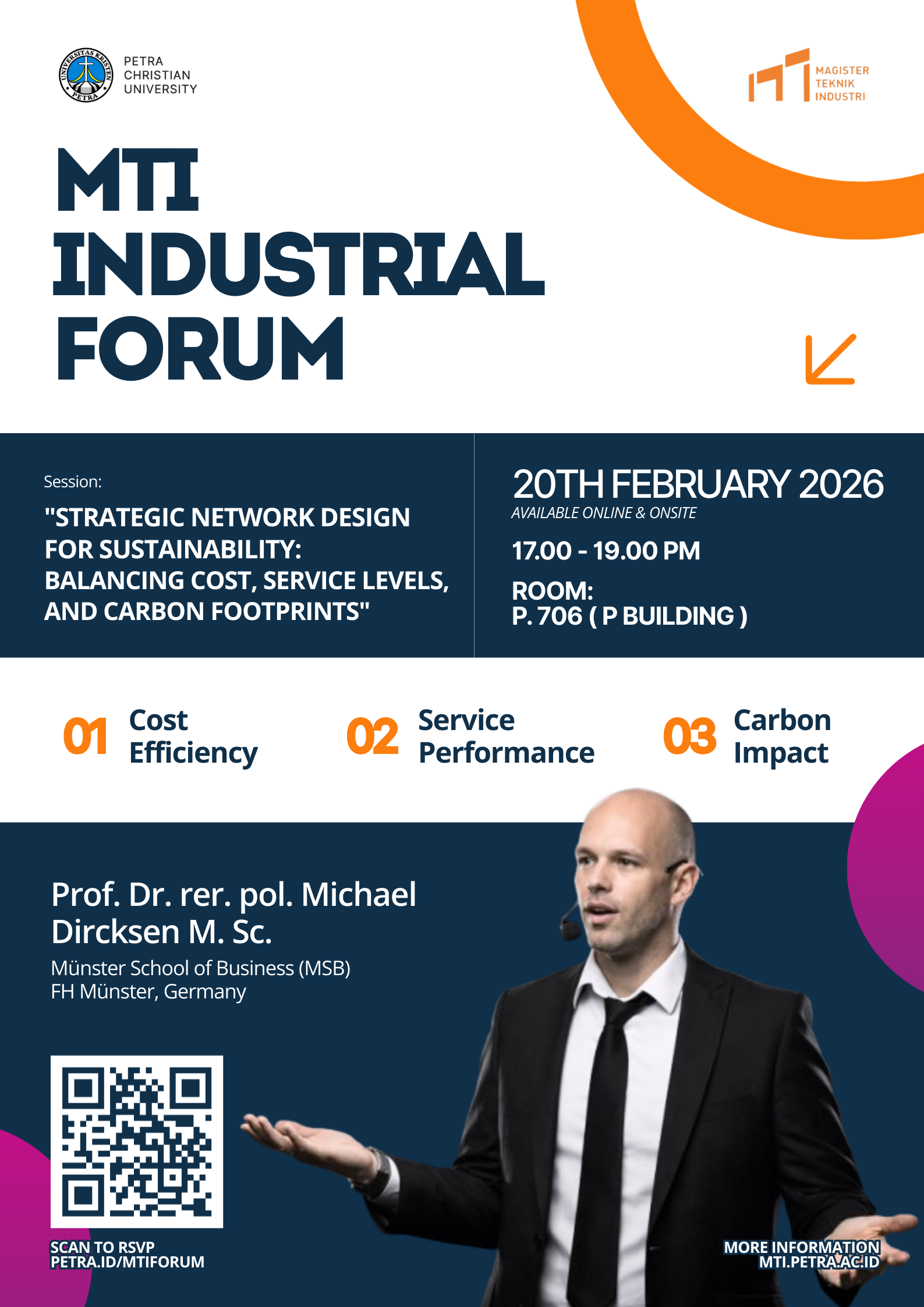 Siap Hadapi Masa Depan Industri? 🚀Dunia industri terus bergerak menuju efisiensi dan keberlanjutan—bagaimana kita bisa merancang jaringan operasional yang cerdas, hemat biaya, dan tetap ramah lingkungan?Jangan lewatkan MTI Industrial Forum dengan topik: "Strategic Network Design for Sustainability: Balancing Cost, Service Levels, and Carbon Footprints."Menghadirkan pembicara ahli dari Jerman:🎙 Prof. Dr. rer. pol. Michael Dircksen, M.Sc.Münster School of Business (MSB), FH Münster, GermanyPelajari bagaimana desain jaringan strategis dapat meningkatkan cost efficiency, service performance, sekaligus menekan carbon impact dalam supply chain modern.📅 20 Februari 2026⏰ 17.00 – 19.00 WIB📍 Ruang P706, Gedung P – UK Petra💻 Hybrid (Online & Onsite)🔗 Daftar sekarang: petra.id/MTIForum