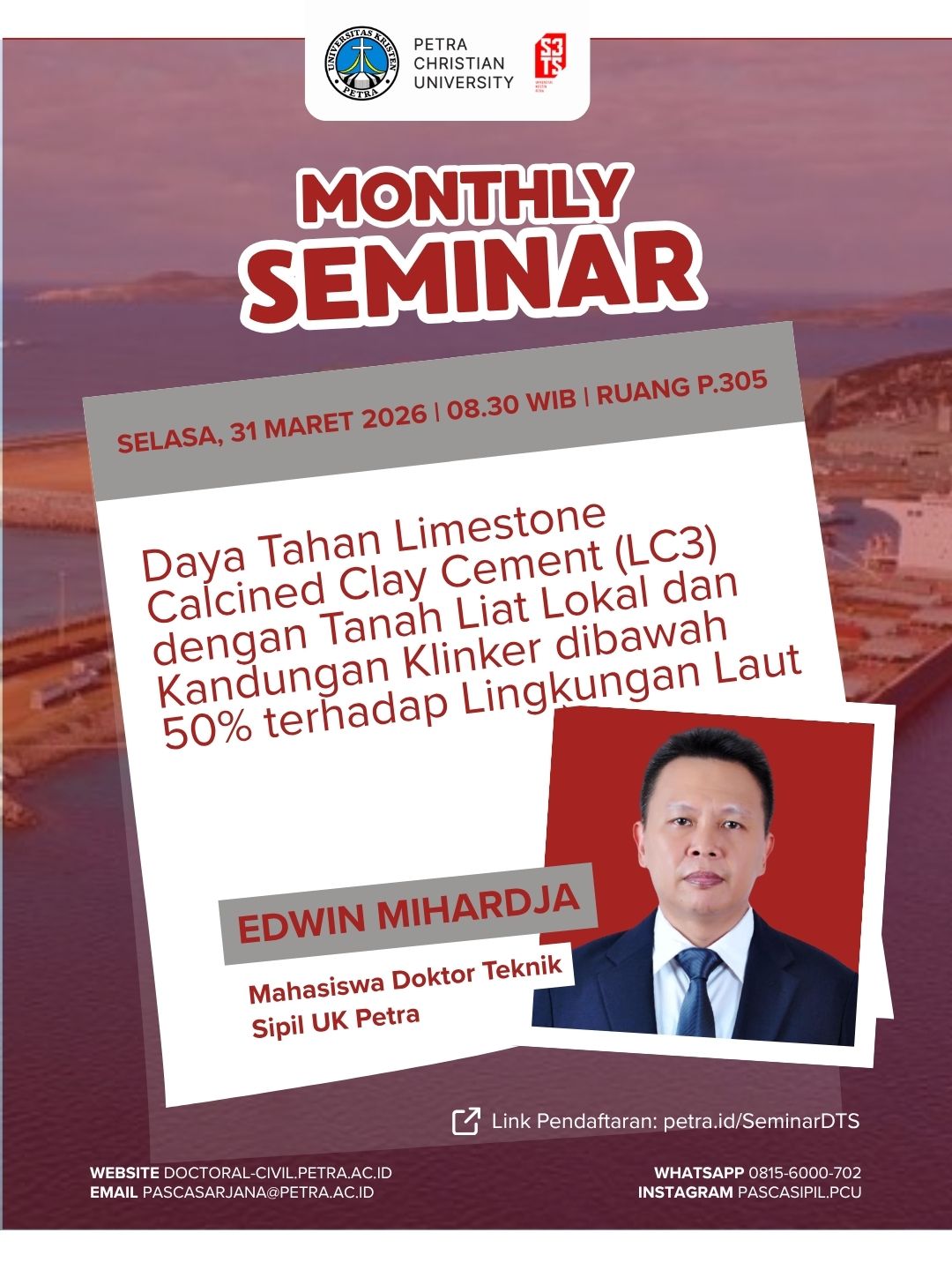 Saatnya menambah wawasan dan insight terbaru di dunia teknik sipil!Topik: Daya Tahan Limestone Calcined Clay Cement (LC3) dengan Tanah Liat Lokal dan Kandungan Klinker dibawah 50% terhadap Lingkungan Laut. Dengan narasumber Edwin Mihardja