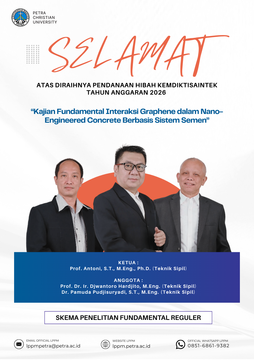 Ucapan selamat atas prestasi yang diraih oleh Prof. Antoni, S.T., M.Eng., Ph.D dan Prof. Dr., Ir. Djwantoro Hardjito, M.Eng serta Dr. Pamuda Pudjisuryadi, S.T., M.Eng. sebagai penerima pendanaan hibah Kemdiktisaintek tahun anggaran 2026, dengan skema Penelitian Fundamental Reguler