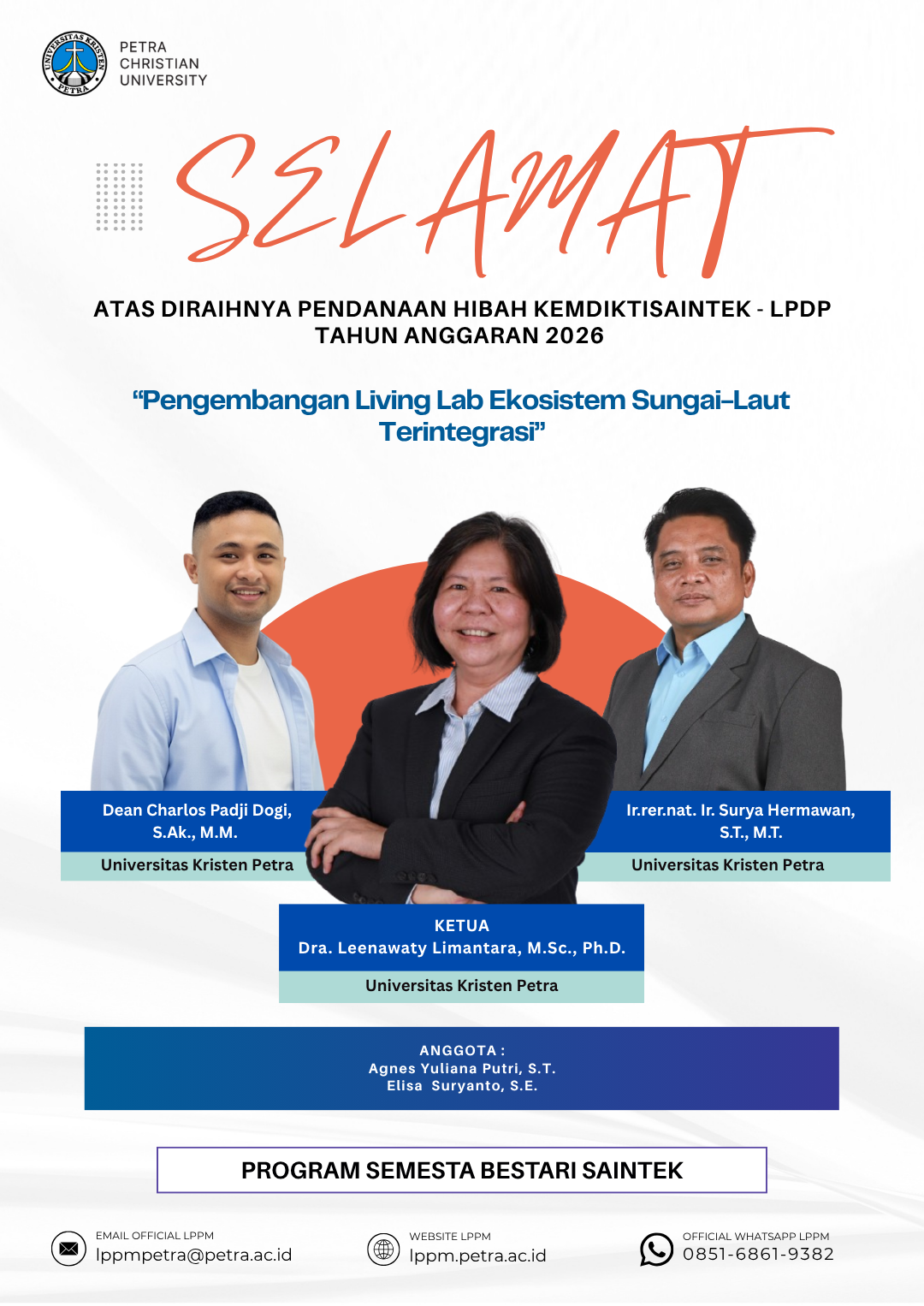 Ucapan selamat atas prestasi yang diraih oleh Dra. Leenawaty Limantara, M.Sc., Ph.D., serta Ir.rer.nat., Ir. Surya Hermawan, S.T., M.T., dan Dean Charlos Padji Dogi, S.Ak., M.M. sebagai penerima pendanaan hibah Kemdiktisaintek - LPDP tahun anggaran 2026, dengan skema Program Semesta Bestari Saintek.