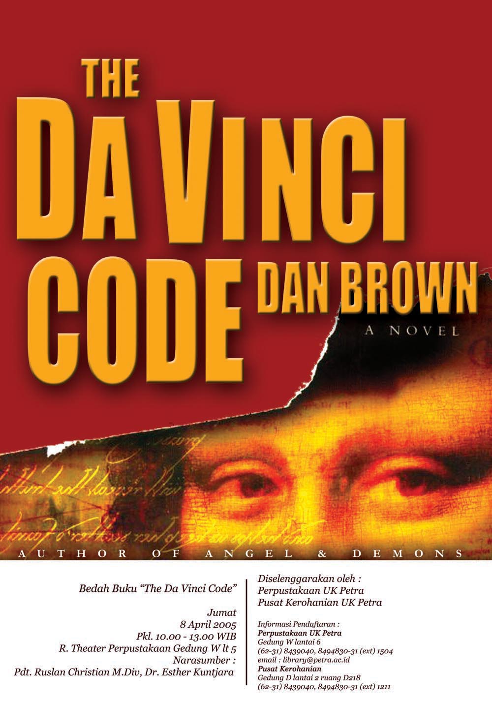Poster ini mengajak sivitas akademika UK Petra yang tertarik untuk ambil bagian dalam acara bedah buku the Da Vinci Code. The Da Vinci Code adalah sebuah karya fiksi (novel) yang terbit tahun 2003. Novel ini telah menimbulkan kontroversi di mana-mana karena alur ceritanya yang mengklaim bahwa Yesus menikah dengan Maria Magdalena dan memberikan fakta lain terhadap proses kononisasi Alkitab. Acara ini diselenggarakan oleh Perpustakaan UK Petra dan Pusat Kerohanian UK Petra bertempat di Ruang Teater Perpustakaan UK Petra Lantai 5 pada tanggal 28 April 2005 yang lalu.
