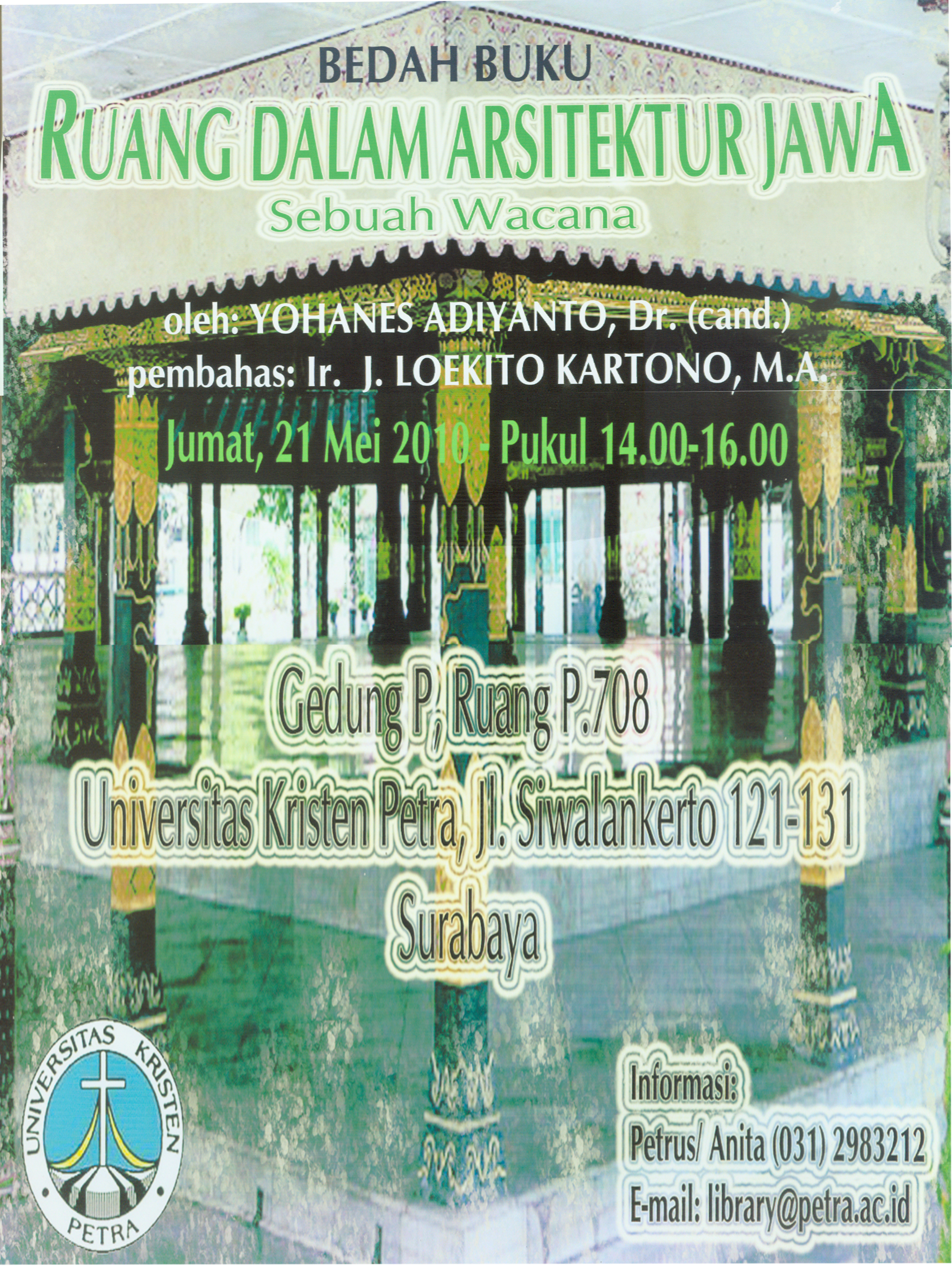 Perpustakaan Universitas Kristen Petra mengadakan acara bedah buku "Ruang Dalam Arsitektur Jawa" pada hari Jumat, 21 Mei 2010 di gedung P ruang 708.