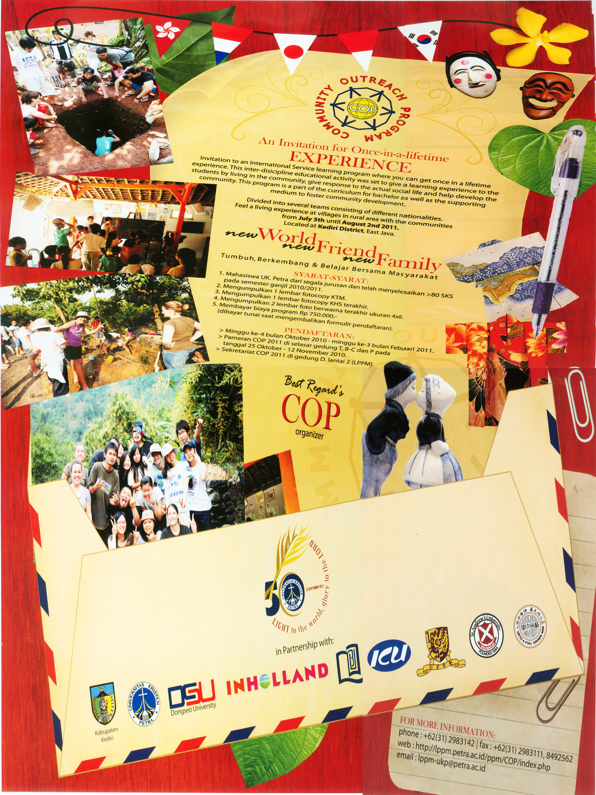 Community Outreach Program is an international service learning program where you can get once in a lifetime experience. Divided into several teams consisting of different nationalities, feel a living experience at villages in rural area with the communities from July 5th until August 2nd 2011.