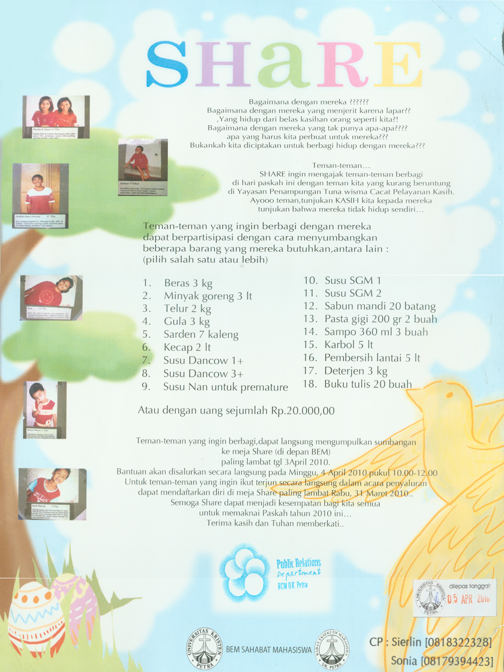 Dalam rangka menyambut Paskah, Badan Eksekutif Mahasiswa mengadakan kegiatan Share. Sesuai namanya, Share ingin mengajak teman-teman mahasiswa berbagi dengan teman yang kurang beruntung di Yayasan Penampungan Tuna Wisma Cacat Pelayanan Kasih. Bantuan akan disalurkan secara langsung pada hari Minggu, 4 April 2010.