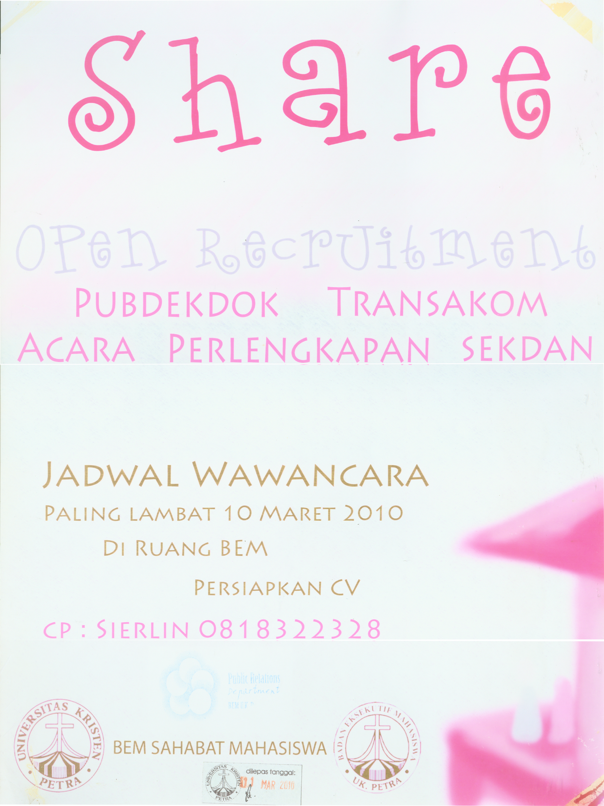 Dalam rangka menyambut Paskah 2010, Badan Eksekutif Mahasiswa mengadakan acara amal bernama Share. BEM UKP juga membuka kesempatan kepada rekan-rekan mahasiswa untuk menjadi panitia dari acara tersebut. Adapun divisi yang ditawarkan antara lain adalah pubdekdok, transakom, acara, perlengkapan dan sekdan. Mahasiswa yang berminat diharapkan mengisi jadwal wawancara paling lambat tanggal 10 Maret 2010.