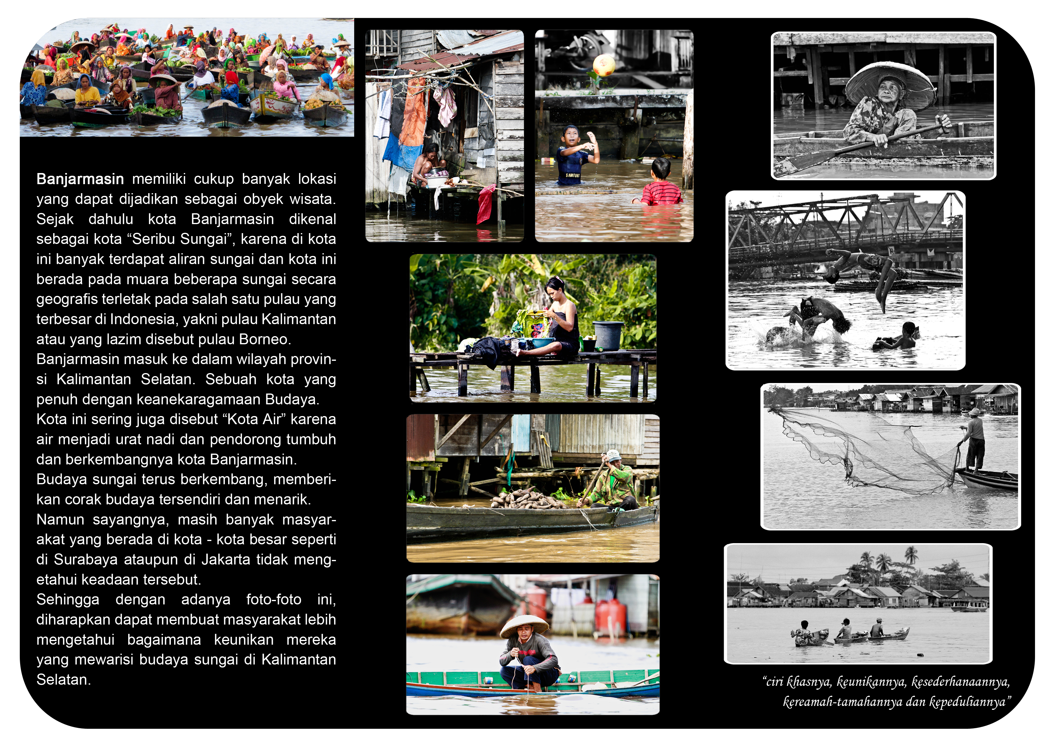 Kota Banjarmasin adalah sebuah kota yang sering di sebut sebagai kota "seribu sungai" karena di kota ini banyak terdapat aliran sungai dan kota ini berada pada muara beberapa sungai secara geografis terletak pada salah satu pulau yang terbesar di Indonesia. Dan kota Banjarmasin memiliki sebuah keunikan budaya sungai yang sampai sekarang masih sangat melekat. Namun sayangnya masih banyak masyarakat yang berada di kota-kota besar tidak mengetahui adanya hal tersebut, maka dari itu dibuat sebuah perancangan foto tentang human interest kehidupan masyarakat di Banjarmasin sekaligus menjadi media untuk menarik wisatawan agar datang ke kota Banjarmasin.