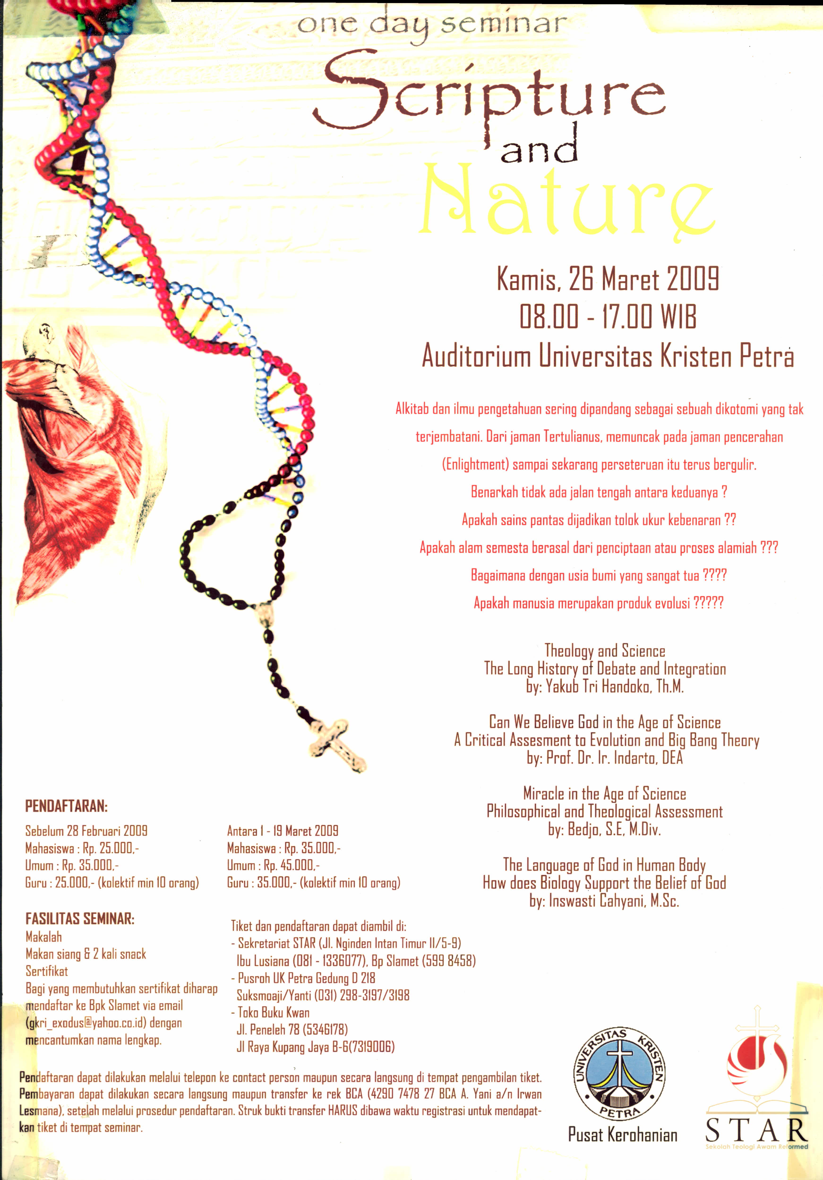 Pusat Kerohanian Petra bekerjasama dengan Sekolah Teologi Awam Reformed menyelenggarakan One Day Seminar dengan mengangkat tema "Scripture and Nature". Seminar berlangsung tanggal 26 Maret 2009 dari pukul 08.00-17.00 di Auditorium Universitas Kristen Petra.