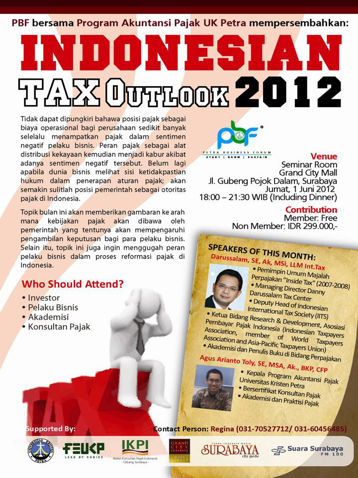 PBF (Petra Business Forum) bersama dengan Program Akuntansi Pajak uK Petra mempersembahkan "Indonesian Tax Outlook 2012" yang diselenggarakan pada tanggal 1 Juni 2012 bertempat di Seminar Room Grand City Mall. Tak dapat dipungkiri bahwa posisi pajak sebagai biaya operasional bagi perusahaan sedikit banyak selalu menempatkan pajak dalam sentimen negatif pelaku bisnis. Topik bulan ini akan memberikan gambaran ke arah mana kebijkan pajak akan dibawa oleh pemerintah yang tentunya akan mempengaruhi pengambilan keputusan bagi para pelaku bisnis.