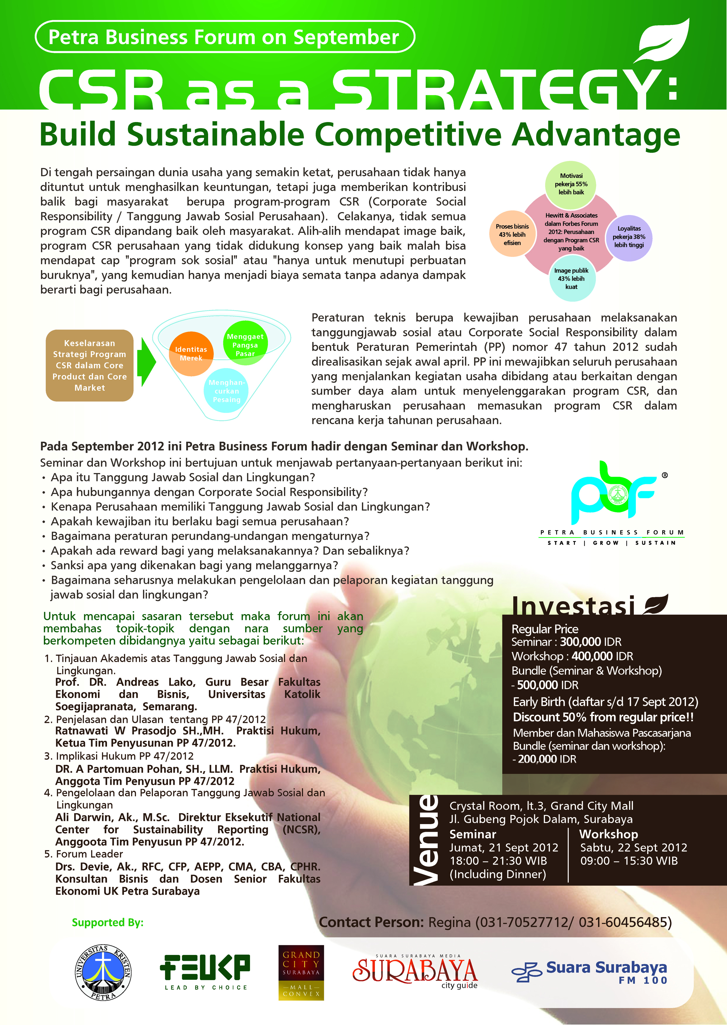 Petra Business Forum on September mempersembahkan "CSR as Strategy : Build Sustainable Competitive Advantage" yang dihelat pada tanggal 21-22 September 2012 bertempat di Crystal Room lt.3 Grand City Mall dan menghadirkan pembicara-pembicara yang kompeten di bidangnya.