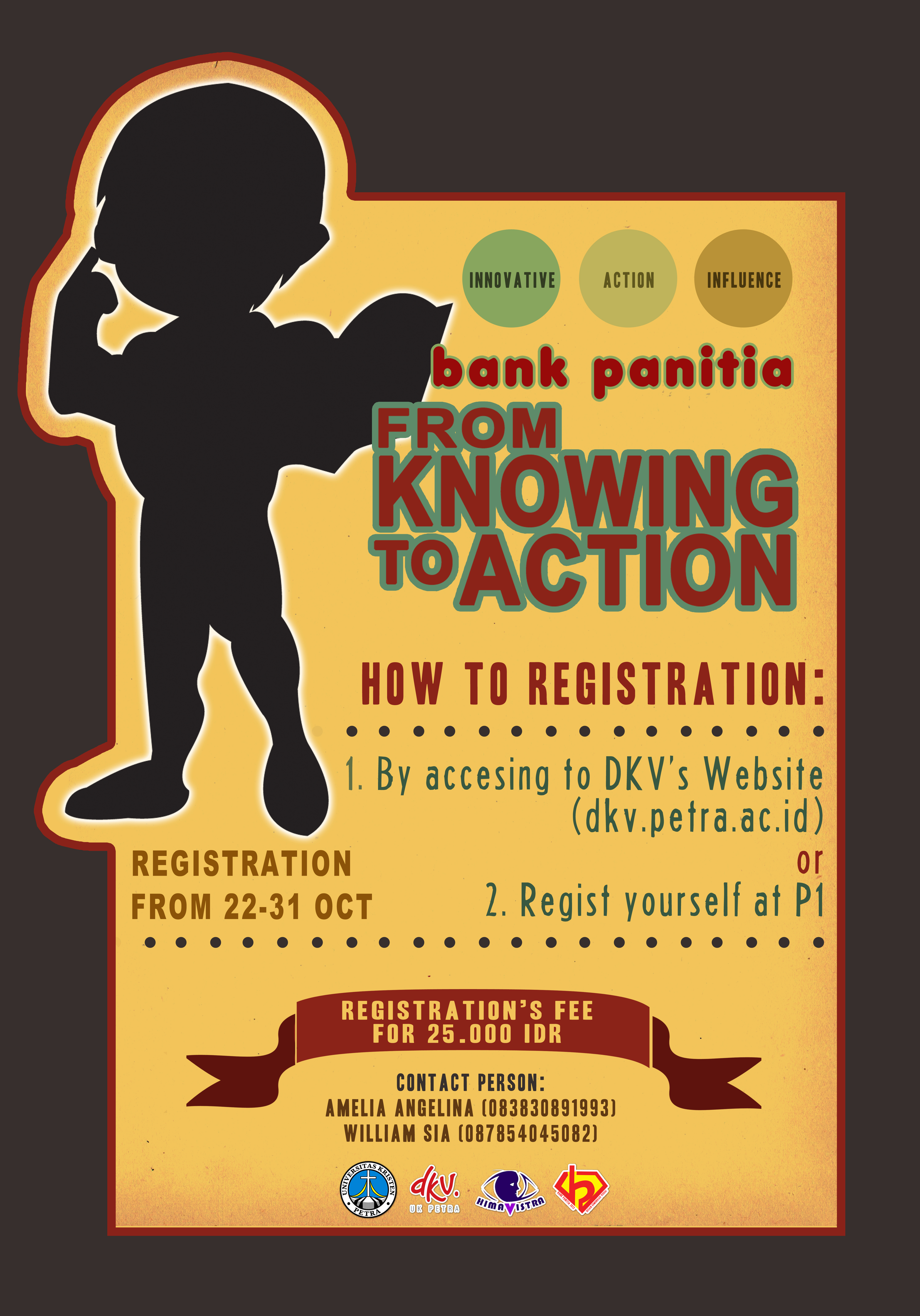 Bank Panitia untuk para mahasiswa DKV kali ini bertajuk "From Knowing to Action". Para mahasiswa yang berminat untuk mendaftar dapat mengunjungi stus DKV atau langsung mendaftarkan diri di selasar P1 pada tanggal 22-31 Oktober 2012.