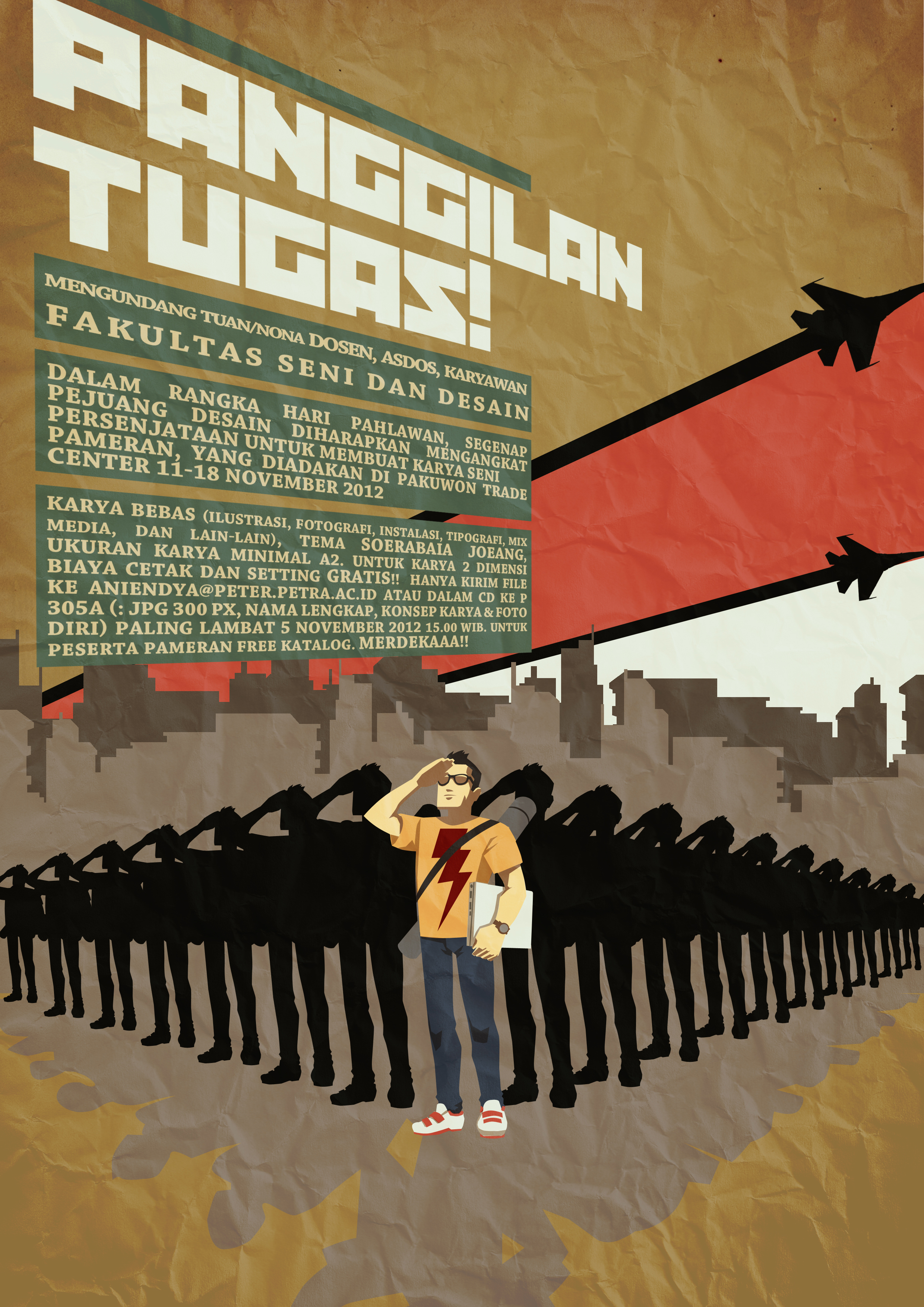 Poster ini berisi undangan bagi seluruh tuan/nona dosen, asdos, karyawan Fakultas Seni dan Desain dalam rangka Hari Pahlawan untuk membuat karya seni pameran yang diadakan di Pakuwon Trade Center pada tanggal 11-18 November 2012.