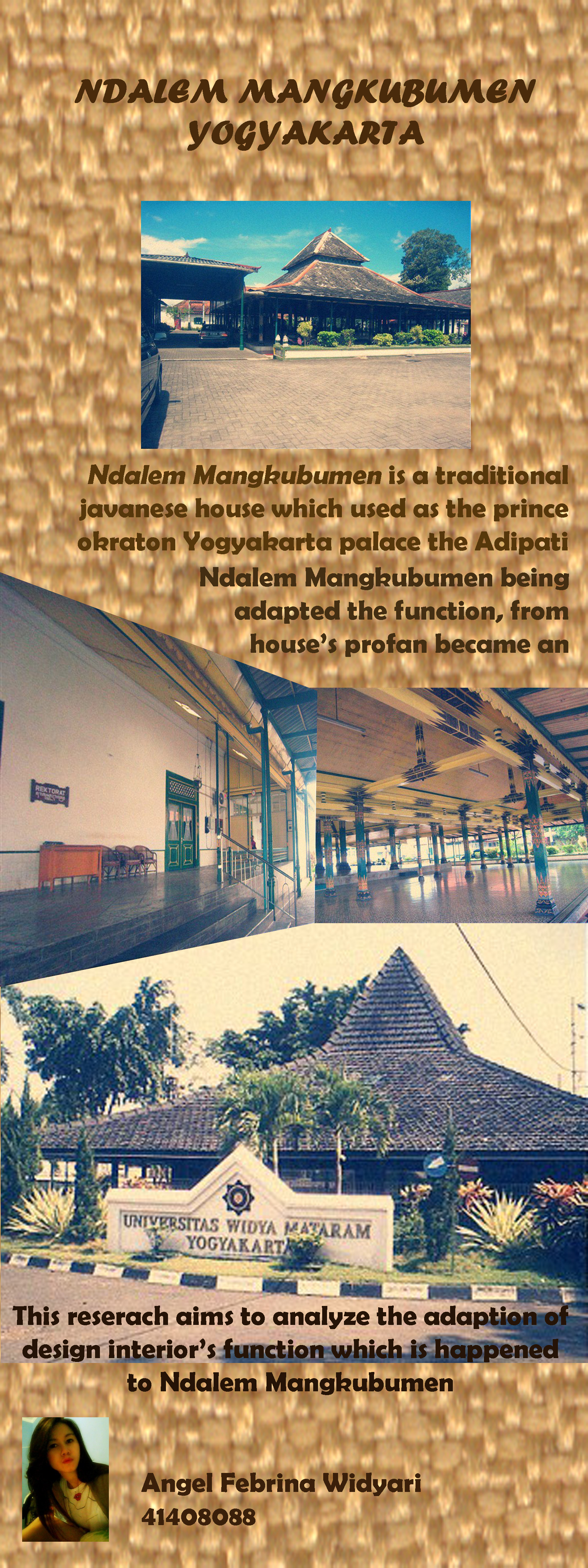 Ndalem Mangkubumen merupakan rumah tradisonal Jawa yang dahulu digunakan sebagai kediaman putra mahkota Kraton Yogyakarta yaitu Adipati Anom, namun seiring berjalanya waktu Ndalem Mangkubumen berganti-ganti fungsi. Saat ini Ndalem Mangkubumen mengalami adaptasi fungsi dari fungsi nilai profan rumah menjadi sarana pendidikkan yaitu Universitas Widya Mataram. Penelitian ini bertujuan untuk menelaah adaptasi fungsi desain interior yang terjadi pada Ndalem Mangkubumen. Dalam penelitian ini yang akan dianalisa lebih lanjut adalah perubahan denah, elemen transisi, elemen pembentuk ruang, elemen pengisi ruang, ragam hias, pencahayaan dan penghawaan yang ada dan terjadi sampai saat ini. Hasil penelitian menunjukkan adanya perubahan fisik pada Ndalem Mangkubumen. Perubahan yang terjadi tidak merusak struktur asli dari Ndalem Mangkubumen, namun adapun kekurangannya adalah belum memenuhi standarisasi bangunan sebagai sarana pendidikan.