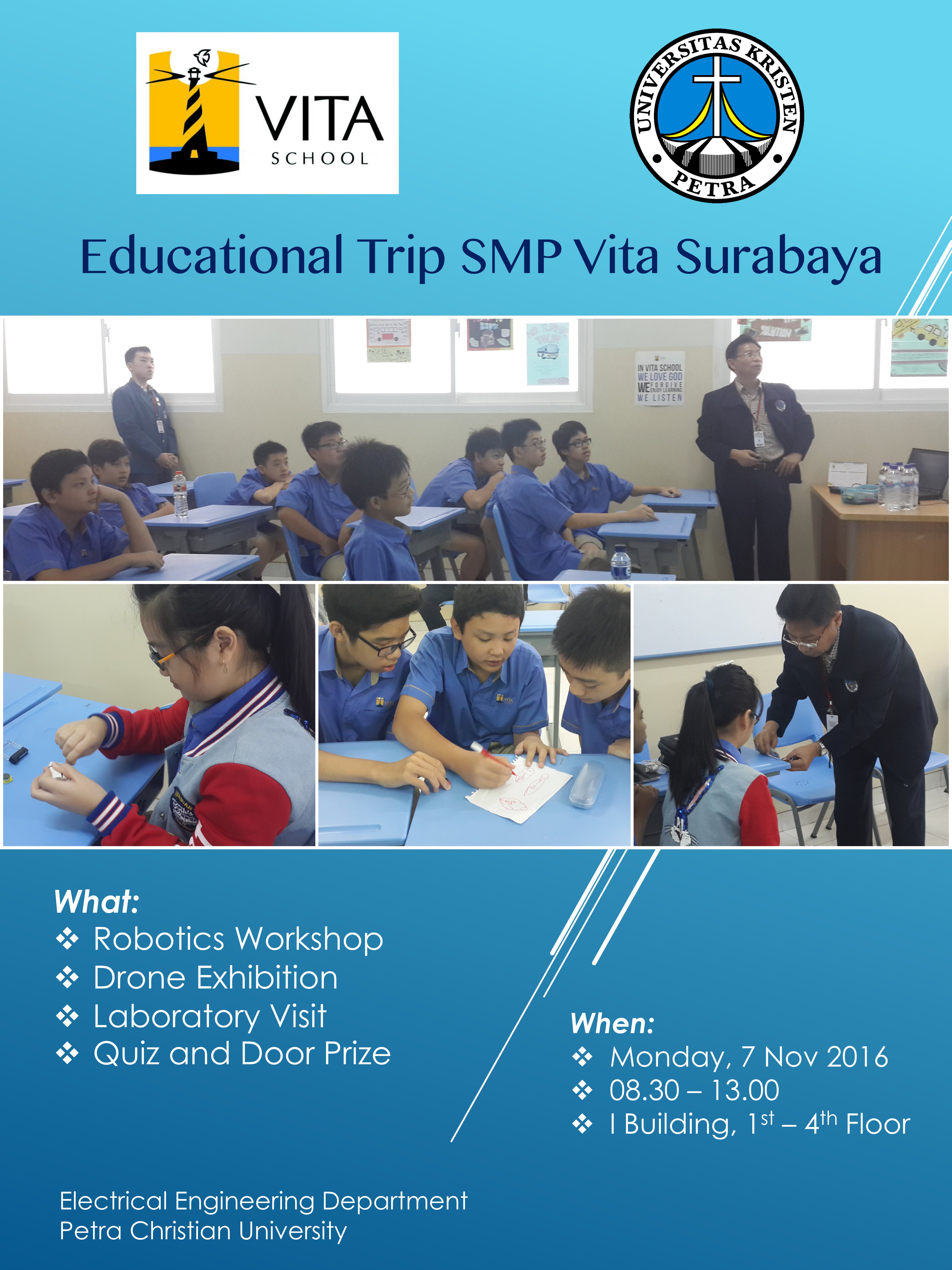 Teknik Elektro UK Petra mengadakan acara Educational trip SMP Vita School. Acara ini diadakan pada 7 November 2016. Dalam kunjungan SMP Vita School ke teknik Elektro ini akan banyak diadakan kegiatan, seperti lomba dan workshop tentang robot.