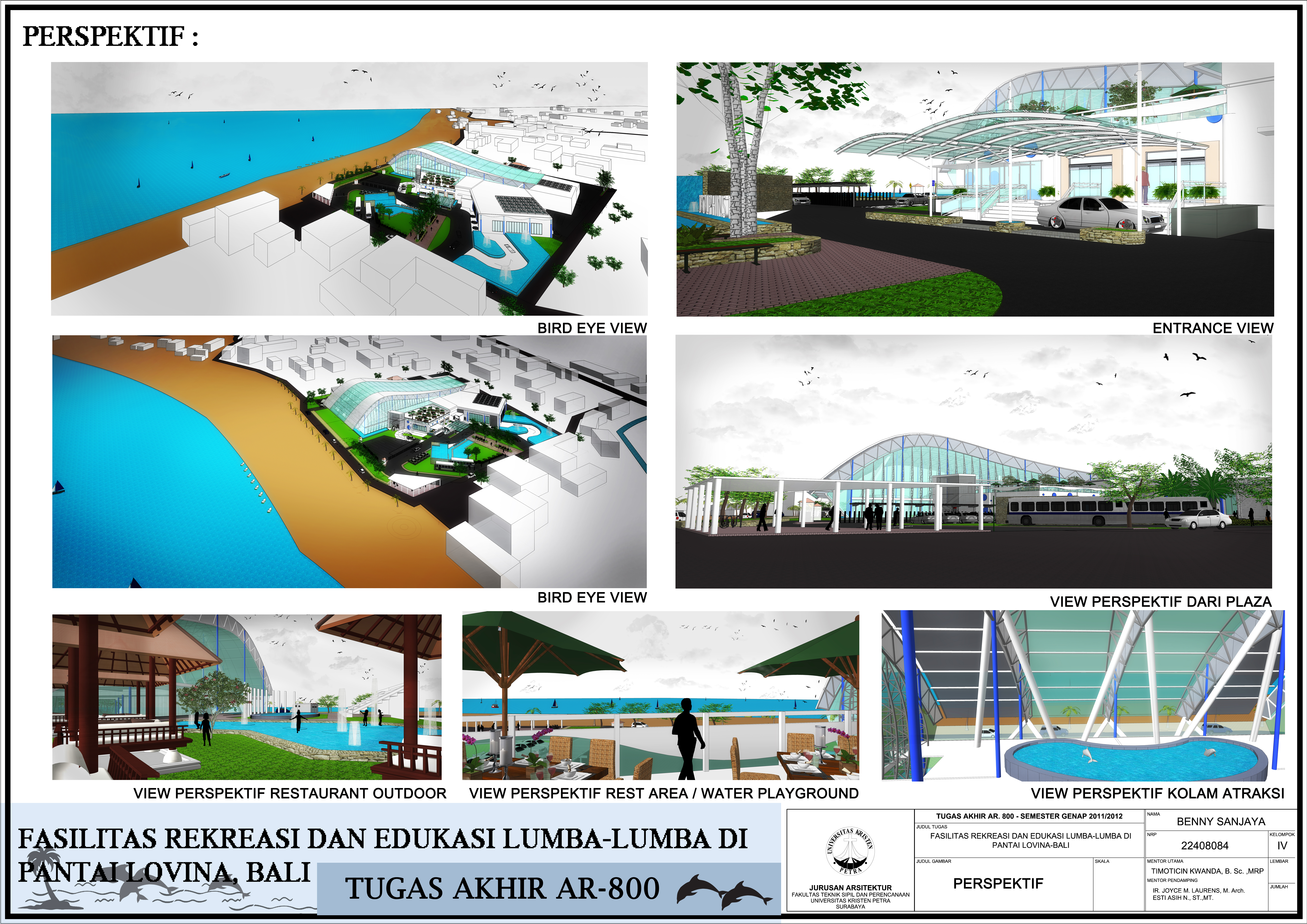 Selain itu, di dalam desain bangunan ini juga memperhatikan potensi yang ada di sekitar tapak. Pemandangan laut yang sangat dominan diterapkan ke dalam fungsi bangunan khususnya kepada fasilitas utama (kolam atraksi dan restaurant).