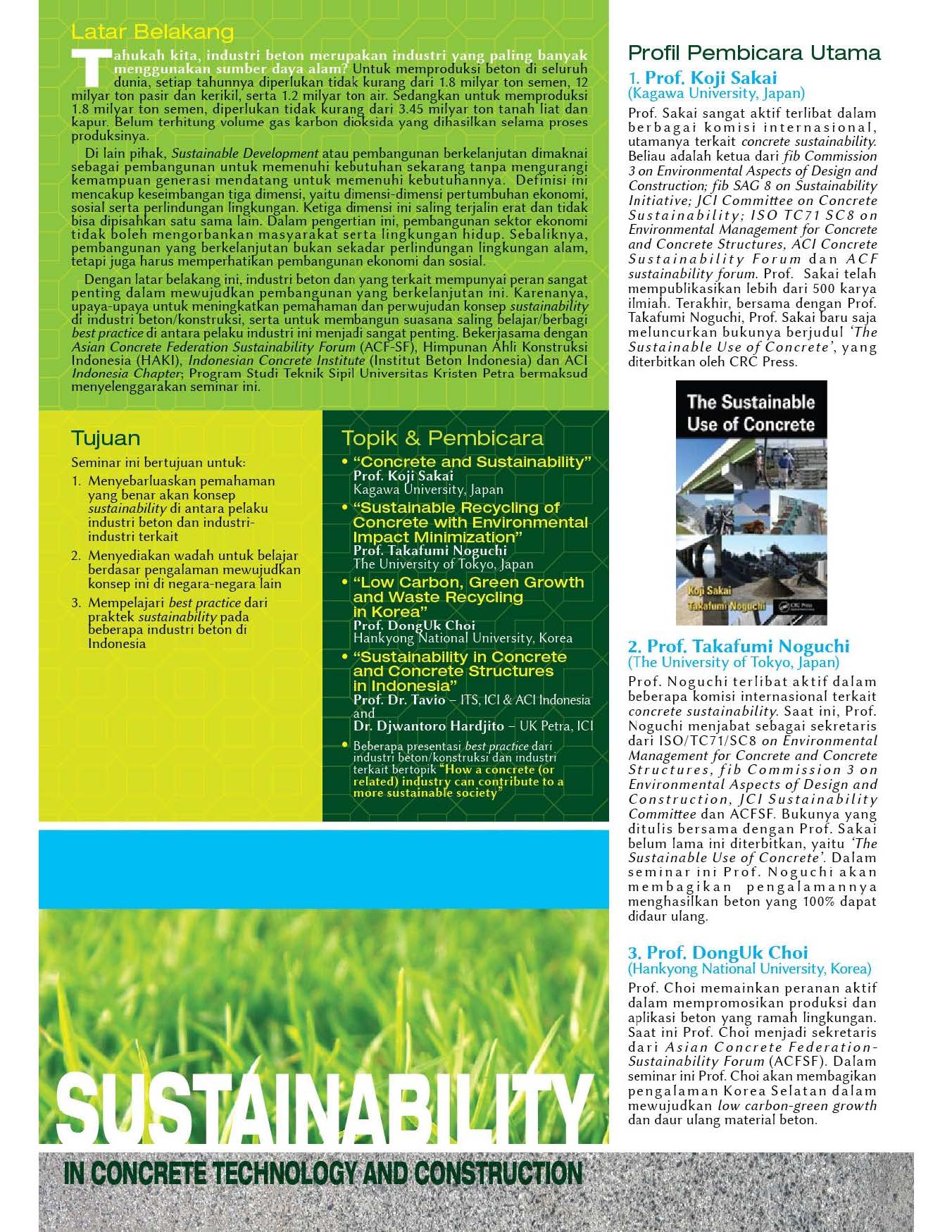 utama. Topik pertama. “Concrete and Sustainability” oleh Prof. Koji Sakai - Kagawa University, Japan; Chairman of ISO/TC71/SC8, fib SAG 8, JCI Sustainability Committee and ACFSF; Penulis buku ‘The Sustainable Use of Concrete’. Topik kedua ialah “Sustainable Recycling of Concrete with Environmental Impact Minimization” olehProf. Takafumi Noguchi - The University of Tokyo, Japan; Secretary of ISO/TC71/SC8, fib commission 3, JCI Sustainability Committee and ACFSF, Penulis buku ‘The Sustainable Use of Concrete. Topik ketiga ialah “Low Carbon, Green Growth and Waste Recycling in Korea” oleh Prof. DongUk Choi – Hankyong National University, Korea –