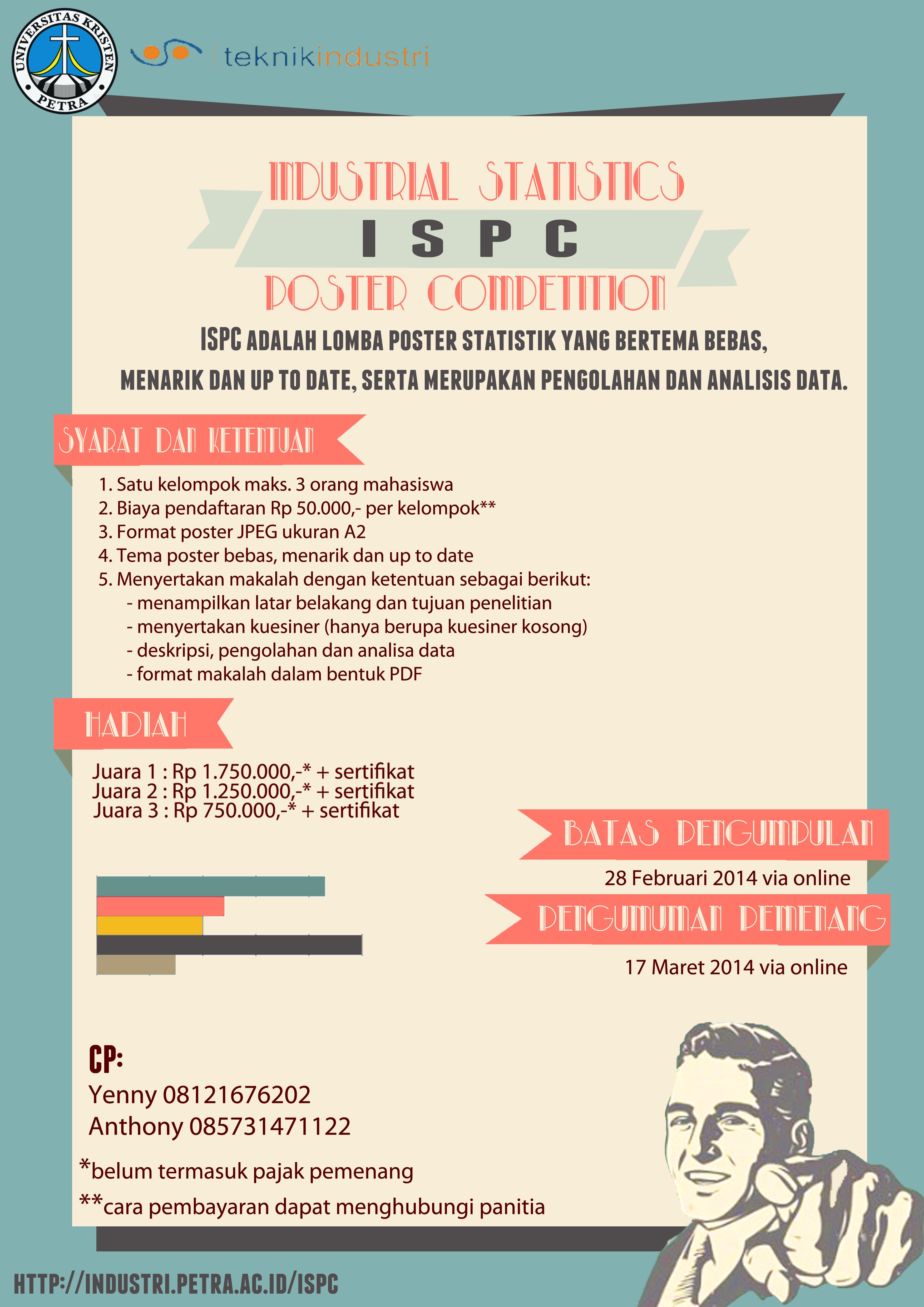 Industrial Statistic Poster Competition merupakan sebuah lomba poster statistik bertema bebas, menarik, dan up-to-date. Acara ini diikuti oleh mahasiswa prodi teknik industri UK. Petra dengan beberapa syarat yang harus dipenuhi. Batas pengumpulan poster ialah tanggal 28 Februari 2014 via online dan pengumuman pemenang akan dilakukan pada 17 Maret 2014.
