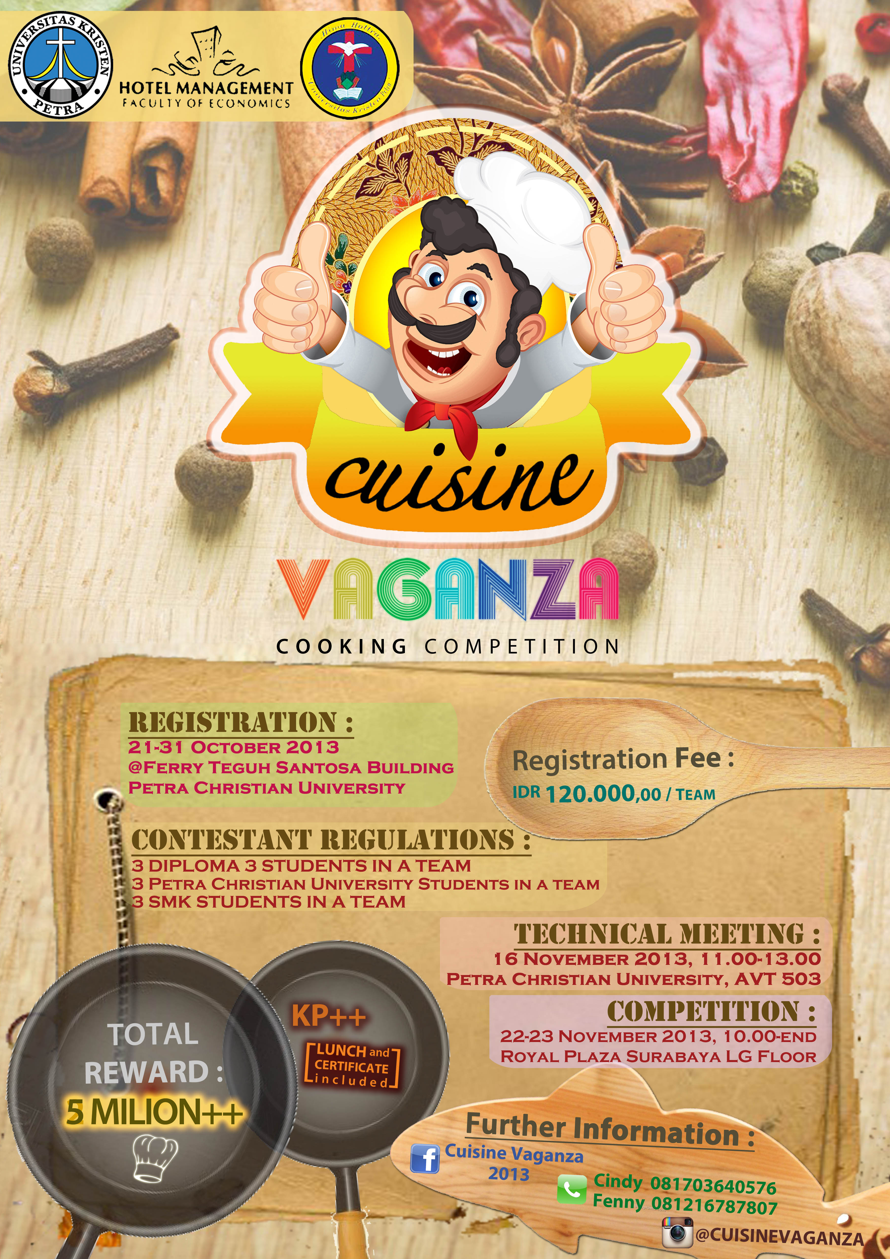Program Manajemen Perhotelan UK. Petra mengadakan lomba memasak bertema Cuisine Vaganza. Acara ini diadakan pada tanggal 22 Nopember 2013 dimana pada tanggal ini seluruh peserta yang mendaftar akan dieliminasi dan pada tanggal 23 Nopember 2013 yang merupakan final pengumuman pemenang lomba. Acara tersebut dibuka untuk umum dan diselenggarakan di Royal Plaza Mall Surabaya dengan guest star dari Master Chef Indonesia yang akan melakukan demo memasak. Biaya pendaftaran untuk mengikuti acara ini ialah sebesar Rp 120.000,00 per team dengan total hadiah sebesar Rp 5.000.000,00.