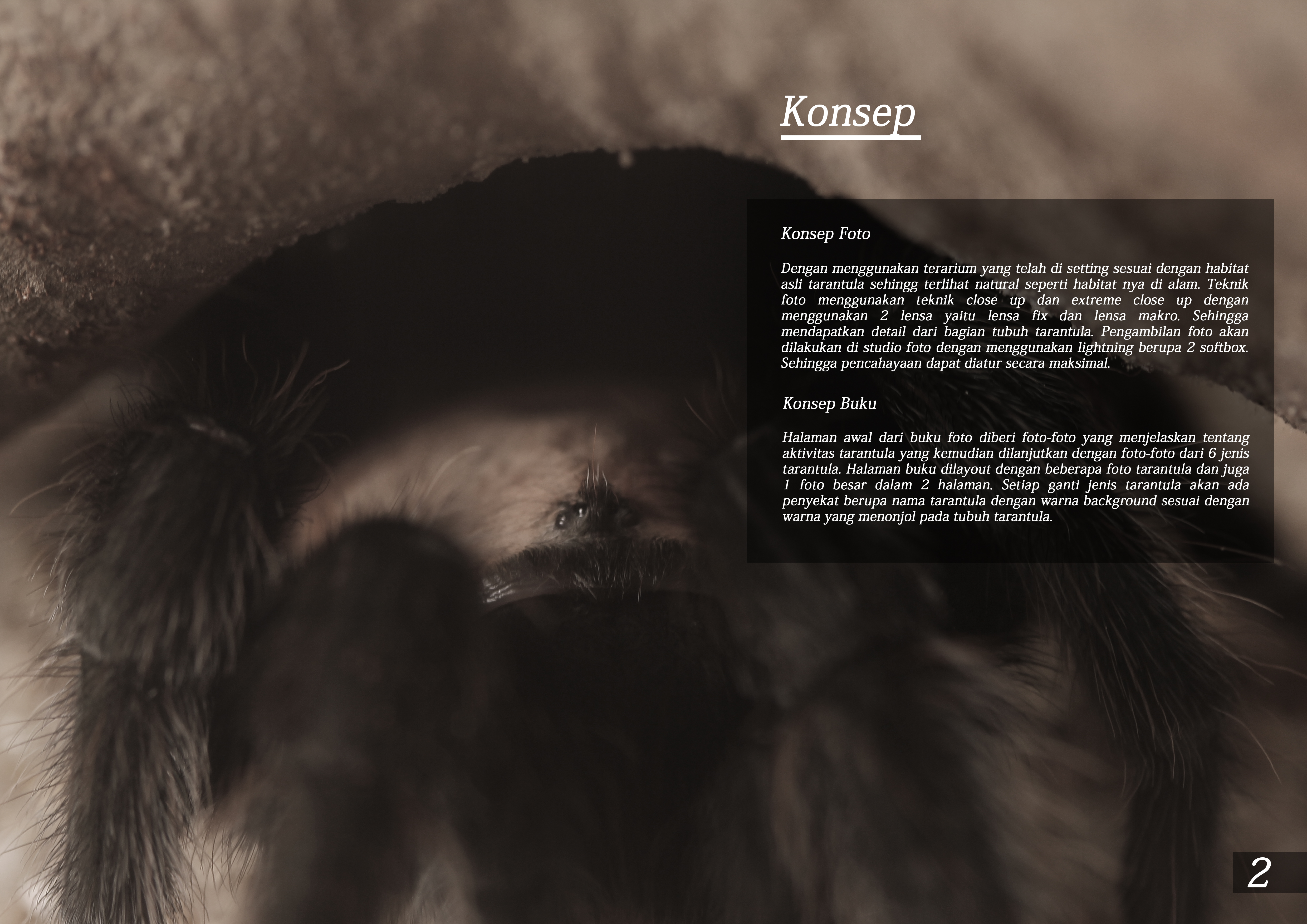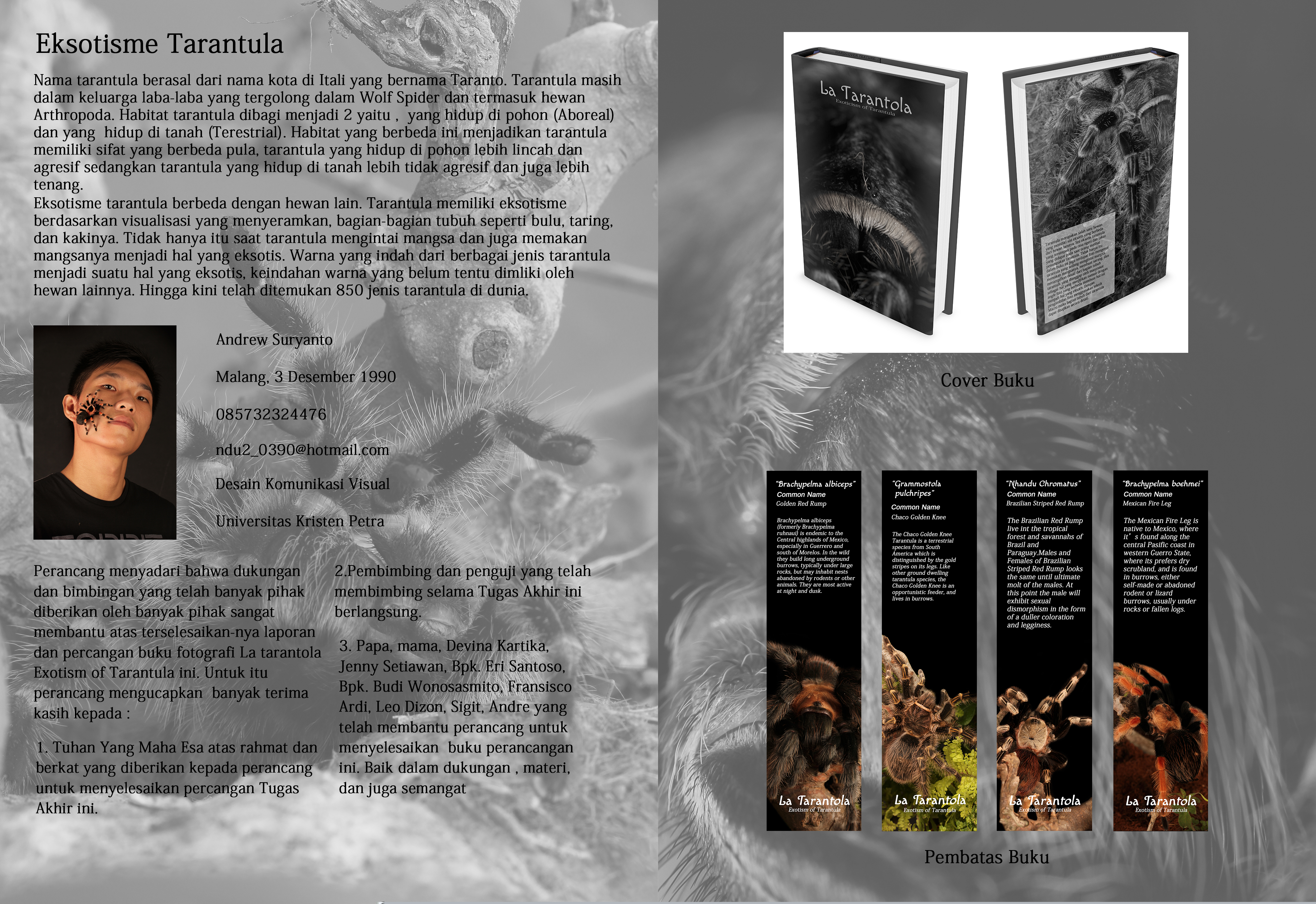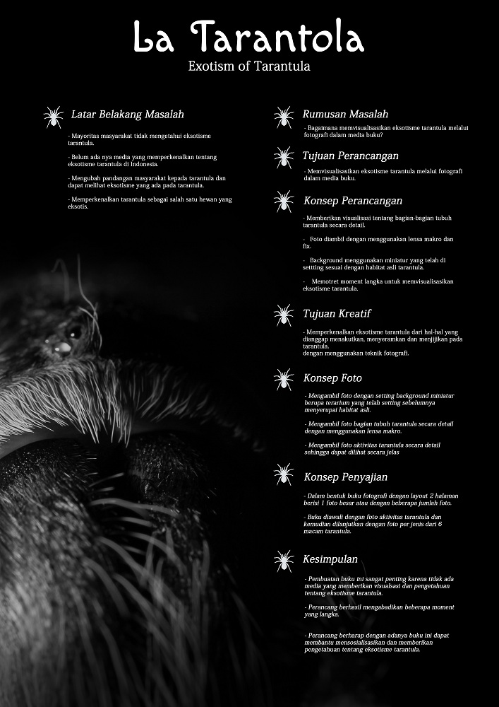 Tarantula merupakan salah satu hewan Arthropoda yang memiliki sisi eksotis yang lain daripada hewan lain-nya. Banyak masyarakat yang tidal mengetahui eksotisme tarantula. Tarantula mulai masuk dan dikenal oleh pecinta hewan di Indonesia mulai tahun 2009. Seiring berjalannya waktu tarantula yang diperjualbelikan semakin beraneka jenis. Baik dari hasil ternak para breeder maupun dari hasil impor dari negara lain. Namun masih banyak masyarakat yang tidak mengeal eksotisme dari hewan ini. Mayoritas masyarakat masih beranggapan bahwa tarantula hewan yang tidak lazim untuk dipelihara. Penampakan tarantula sering dianggap menjijikan, menakutkan dan menyeramkan. Dari sisi yang dianggap tidak lazim itu tarantula menyimpan eksotisme yang unik dan berbeda dari hewan lainnya. Baik dari bagian tubuh, mengintai mangsa, mengeluarkan jaring, memangsa buruan dan juga warna dari berbagai jenis tarantula. Tarantula berbeda dengan hewan seperti kucing dan anjing yang dapat dipegang setiap saat.
