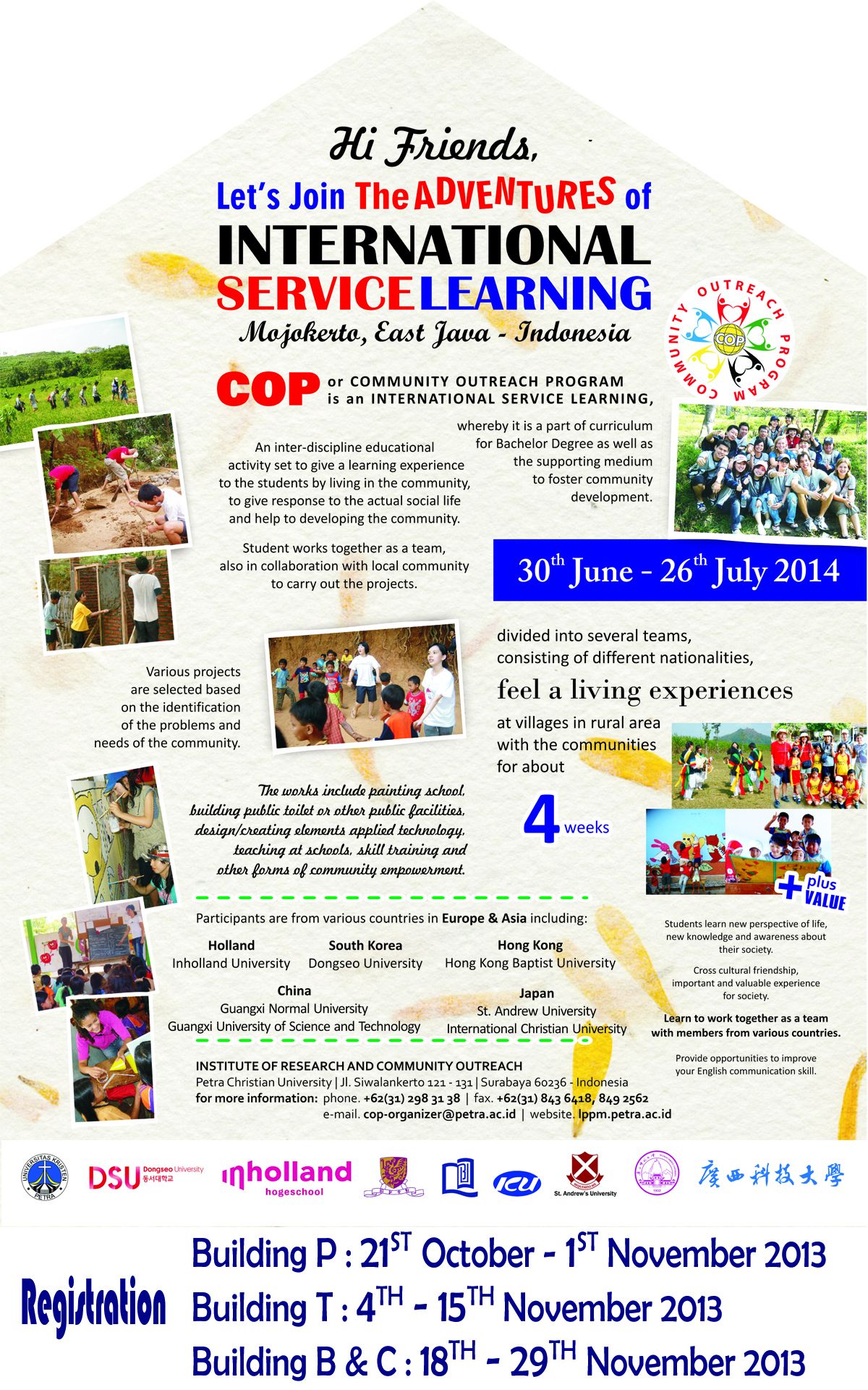 Lembaga Penelitian dan Pengabdian Masyarakat UK. Petra mengadakan COP (Community Outreach Program). COP merupakan international service learning yang mengajak setiap orang untuk dapat melayani sesama. Program ini diadakan di Mojokerto pada tanggal 30 Juni-26 Juli 2014. Pendaftaran untuk mengikuti program ini dilakukan pada tanggal 21 Oktober hingga 29 Nopember 2013.