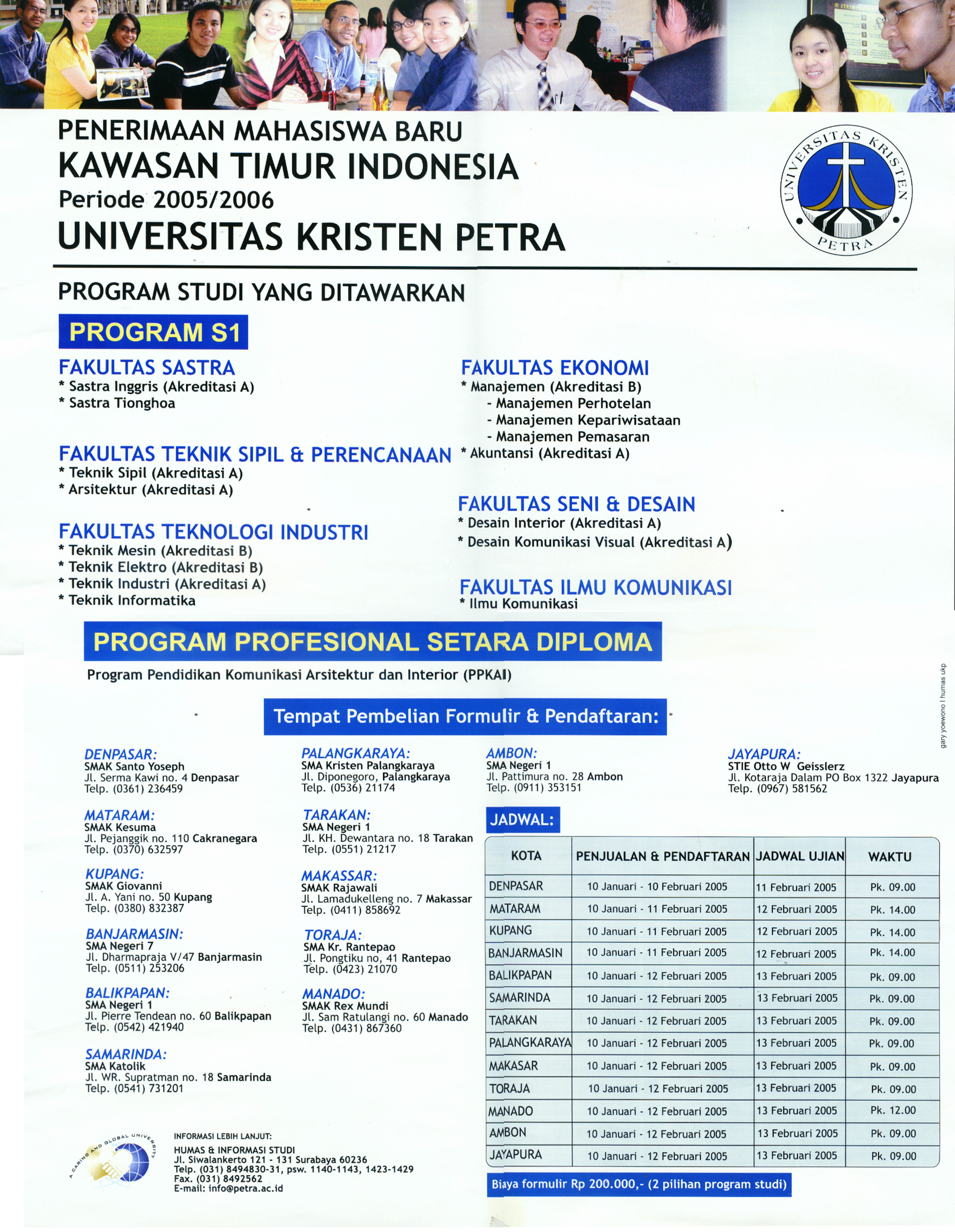 Informasi dalam poster ini meliputi program studi yang ditawarkan, meliputi program S1, program profesional setara diploma, tempat pembelian formulir dan pendaftaran (di beberapa kota di Kawasan Timur Indonesia, seperti Denpasar, Mataram, Kupang, Banjarmasin, Samarinda, Palangkaraya, Tarakan, Makassar, Toraja, Manado, Ambon, dan Jayapura), serta jadual penjualan dan pendaftaran, jadual ujian di kota-kota yang disebut di atas.