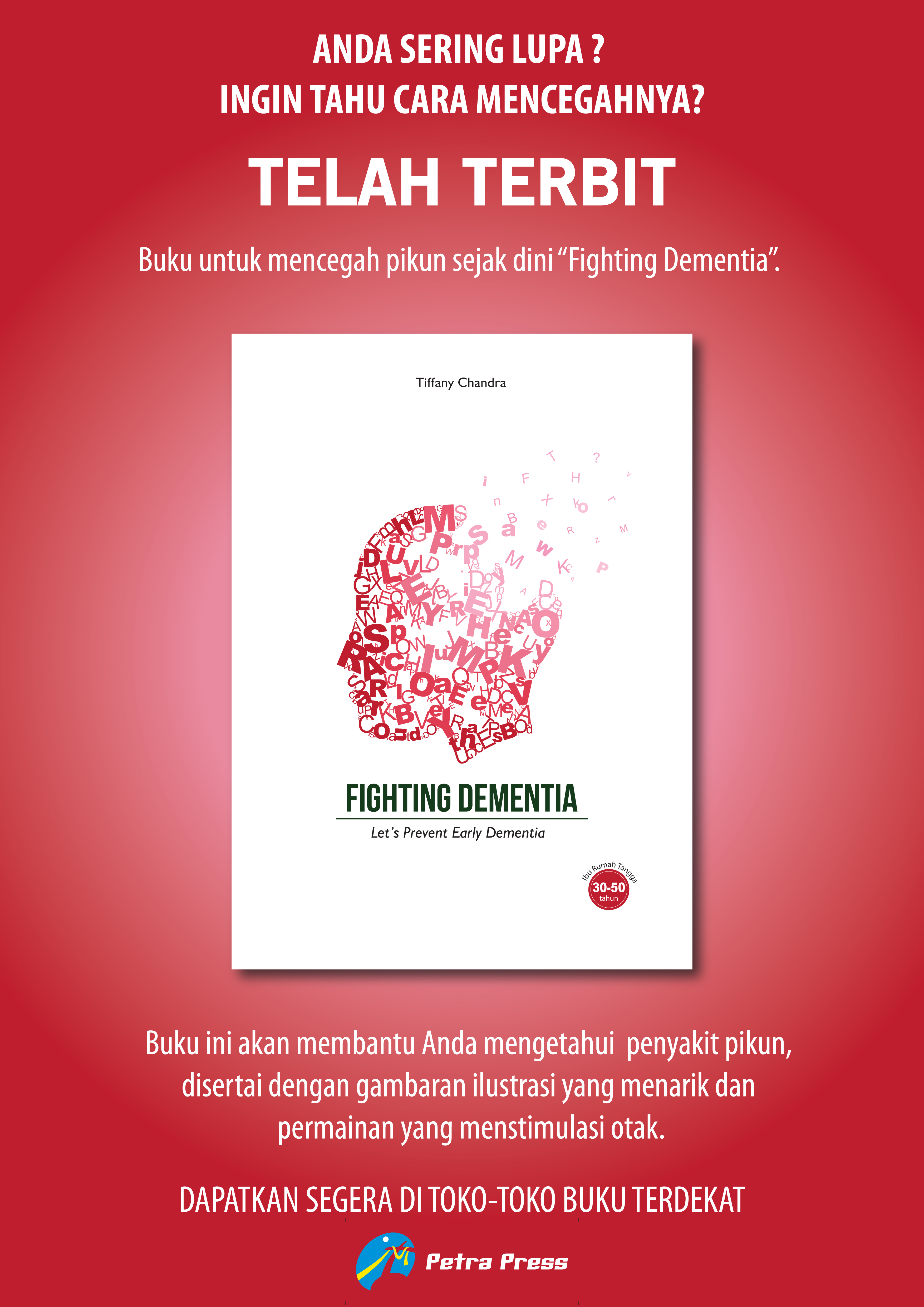 Saat ini gejala pikun banyak dialami oleh orang yang berusia muda karena kurangnya melakukan aktivitas kognitif di mana hal ini mudah terjadi pada ibu rumah tangga. Salah satu upaya yang dapat dilakukan untuk mengurangi resiko penyakit pikun sejak dini pada ibu rumah tangga adalah dengan memberikan edukasi tentang penyakit tersebut sejak dini. Perancangan Buku Ilustrasi pencegahan pikun sejak dini ini dibuat dengan gambaran ilustrasi agar ibu rumah tangga lebih tertarik dalam membaca buku ini. Tujuan Penelitian ini adalah membantu mengurangi jumlah penderita pikun. Metode penelitian yang dipakai yaitu metode kualitatif.