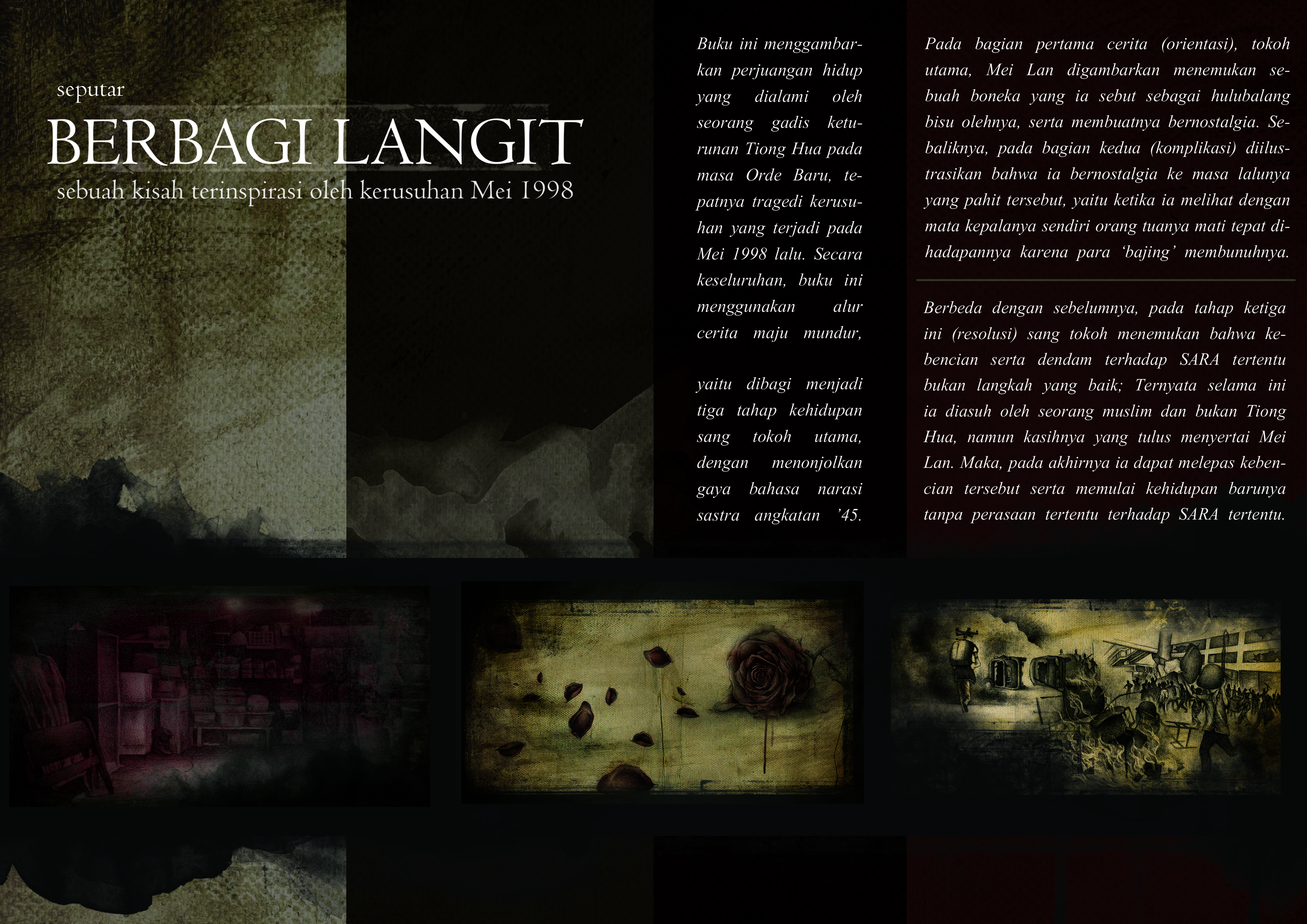 Di era visual ini, ilustrasi merupakan sebuah medium komunikasi yang efektivitasnya cukup mapan. Melalui buku ilustrasi, penulis membuat sebuah narasi mengenai tragedi Mei 1998. Metode yang digunakan adalah dengan membuat buku ilustrasi, yaitu ilustrasi realis. Bahasa yang digunakan adalah sastra lama (campuran melayu dan angkatan 45) yang melambangkan perjuangan tokoh utama tersebut.