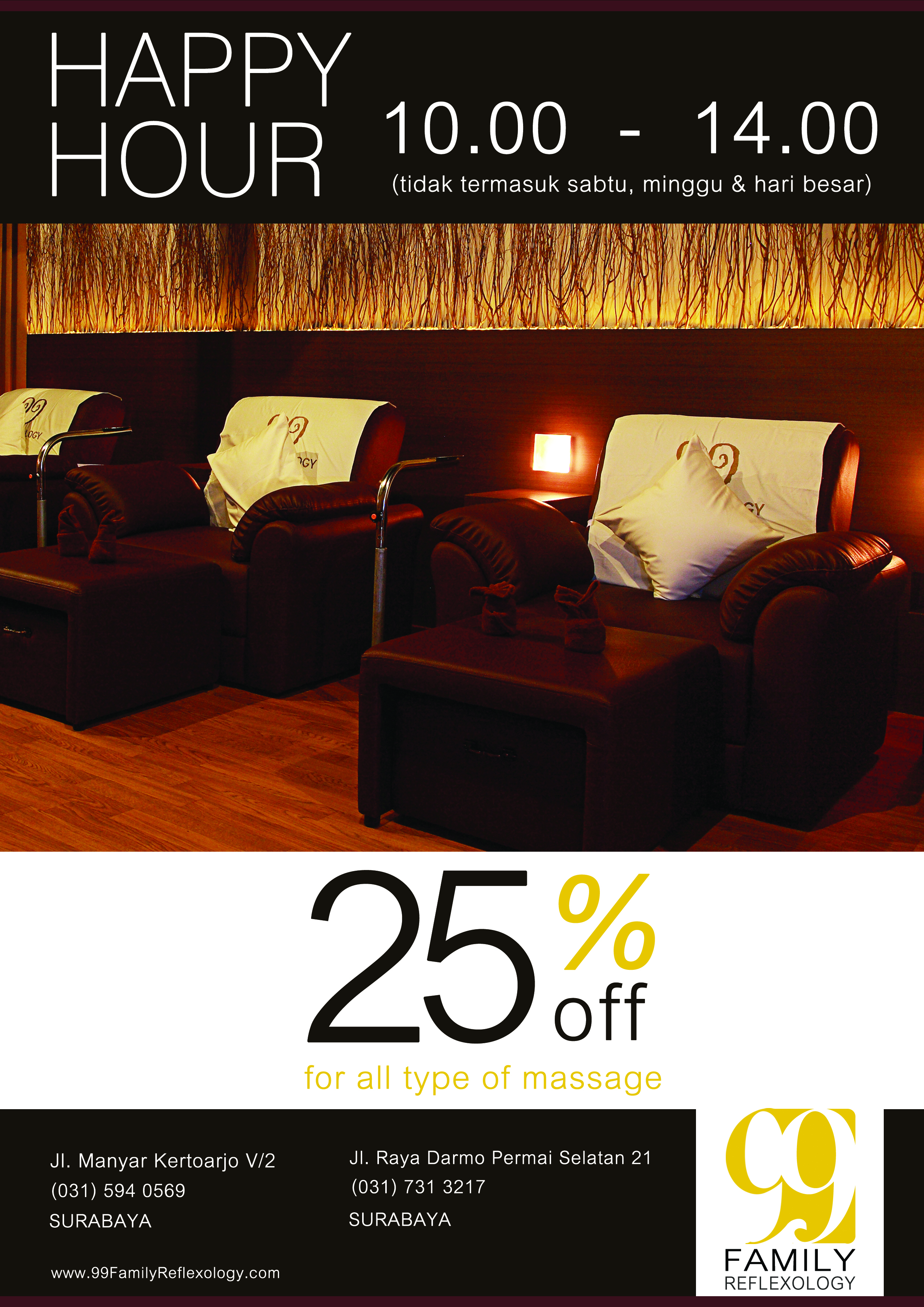 99 Family Reflexology adalah perusahaan yang bergerak di bidang kesehatan berlokasi di Surabaya. Permasalahan yang dimiliki 99 Family Reflexology adalah identitas yang tidak konsisten, paten, dan berubah-ubah antara media satu dengan media yang lainnya, sehingga diperlukan perancangan corporate identity yang konsisten, unik, dan menuangkan visi misi dari 99 Family Reflexology.