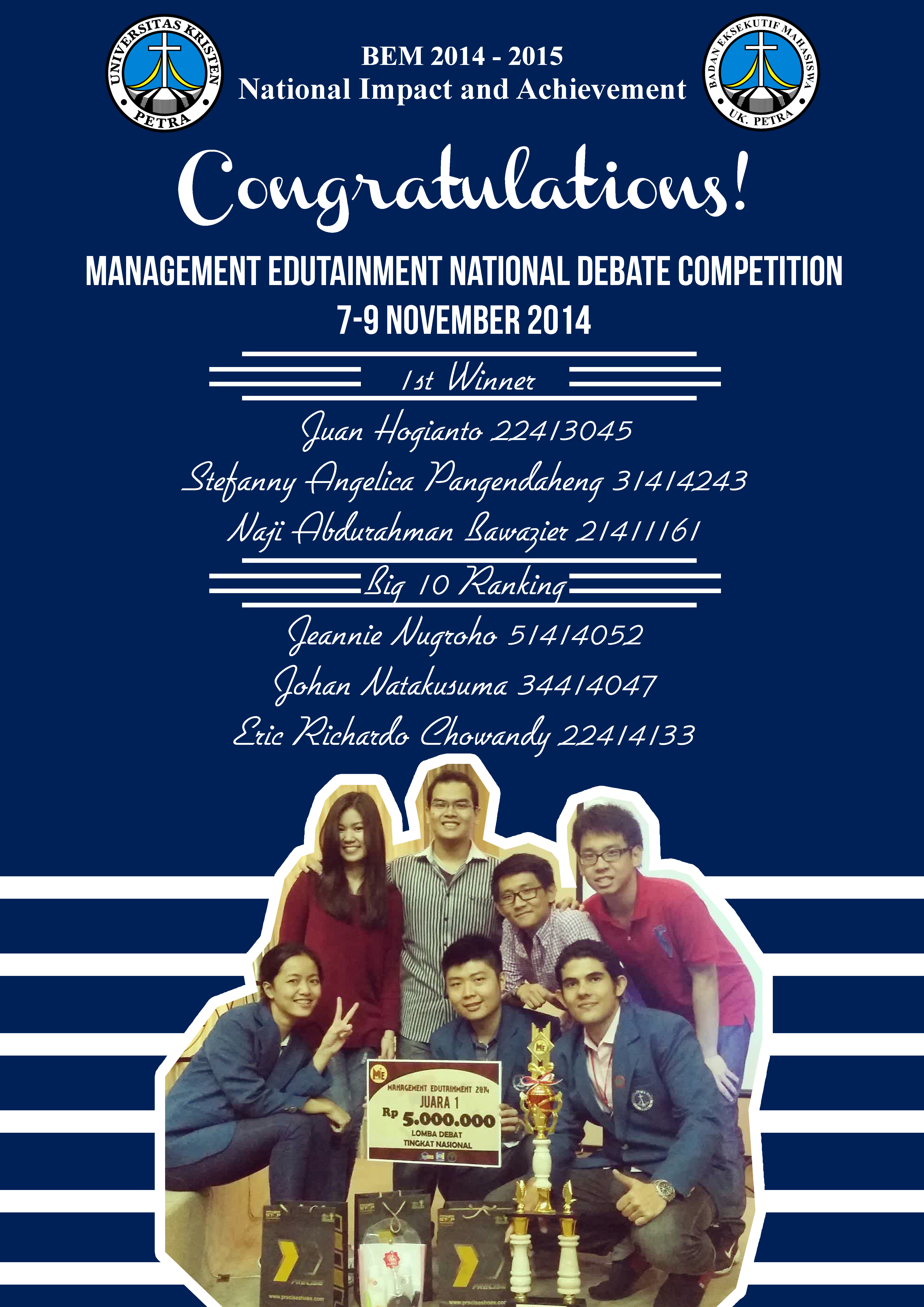 Selamat atas diraihnya Juara 1 dan 10 besar yang diraih mahasiswa UK Petra dalam “Management Edutainment National Debate Competition”