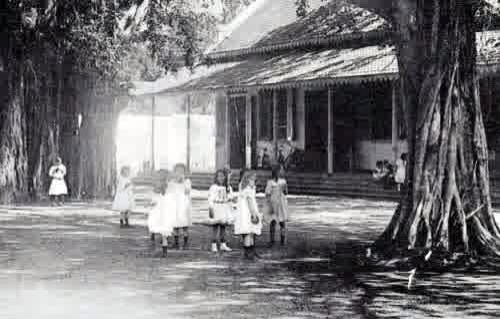 Gambar ini diambil dari dua pohon beringin di halaman sekolah tersebut, yang salah satunya sudah tidak ada tapi yang lain masih berdiri di sana. Di naungan pohon beringin di halaman sekolah tersebut, tampak sekelompok murid putri bermain Sunda Manda, berasal dari bahasa Belanda “Zondag Maandag” yang artinya “Hari Minggu Hari Senin.”