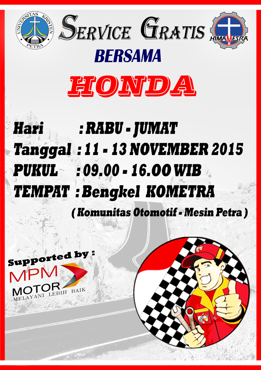 Service gratis bersama Honda, adalah kegiatan yang diadakan oleh HIMAMESRA (Himpunan Mahasiswa Mesin Petra). Kegiatan tersebut dilaksanakan pada hari Rabu – Jumat, 11-13 November 2015, pada pukul 09.00-16.00 WIB, bertempat di Bengkel KOMETRA. Kegiatan yang dilaksanakan selama 3 hari tersebut, tidak memungut biaya apapun pada peserta.