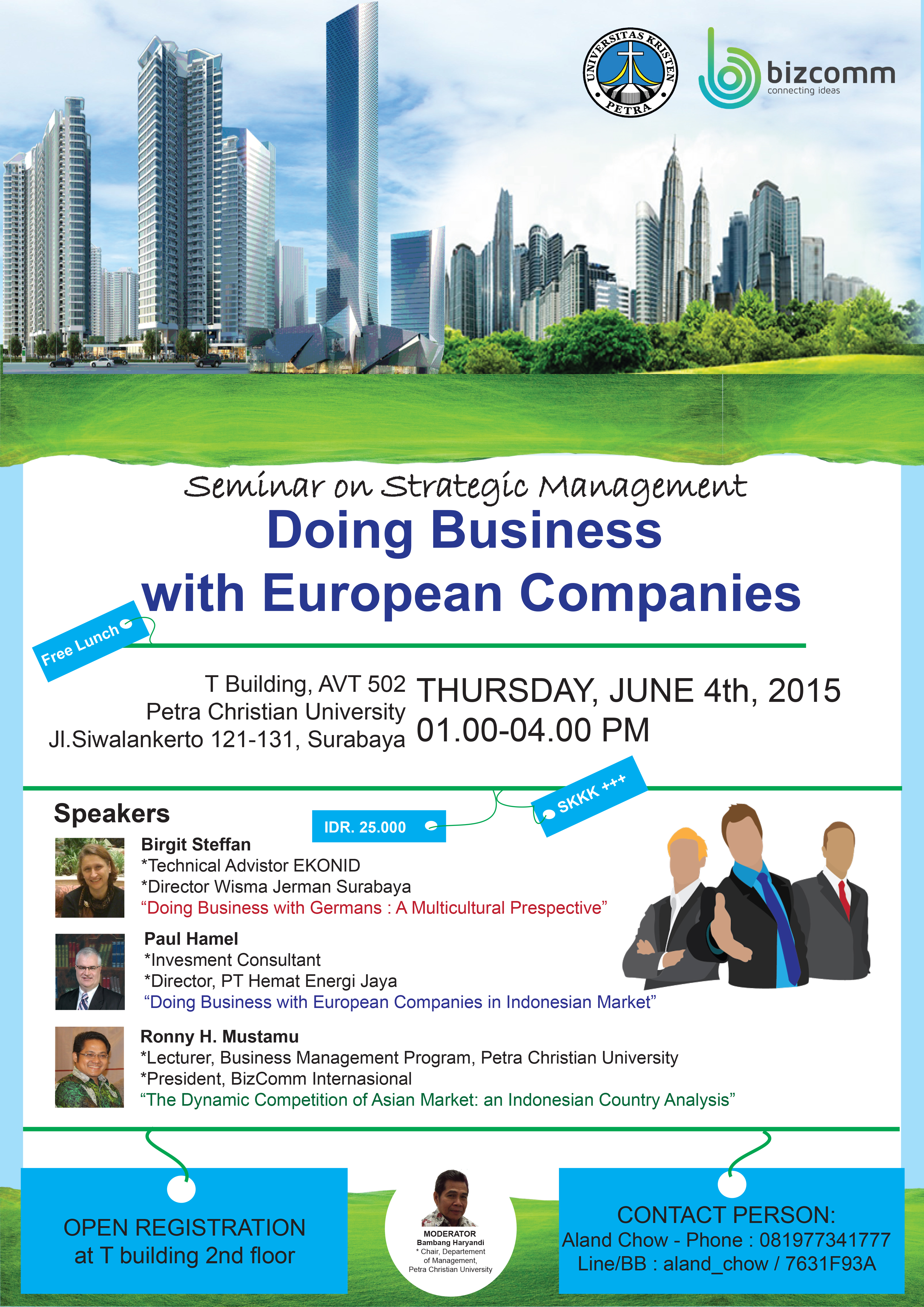 Seminar Manajemen Strategi dengan tema “Doing Business with European Companies” diadakan oleh prodi Manajemen Bisnis UK Petra. Kegiatan seminar dilaksanakan pada hari Kamis, 4 Juni 2015 pada pukul 13.00-16.00 WIB bertempat di Gedung T, AVT 502. Bagi mahasiswa yang berminat dapat melakukan pendaftaran dan membayar biaya pendaftaran sebesar Rp 25.000. dalam kegiatan tersebut, mengundang Brigit Steffan, Paul Hamel, dan Ronny H. Mustamu sebagai pembicara.