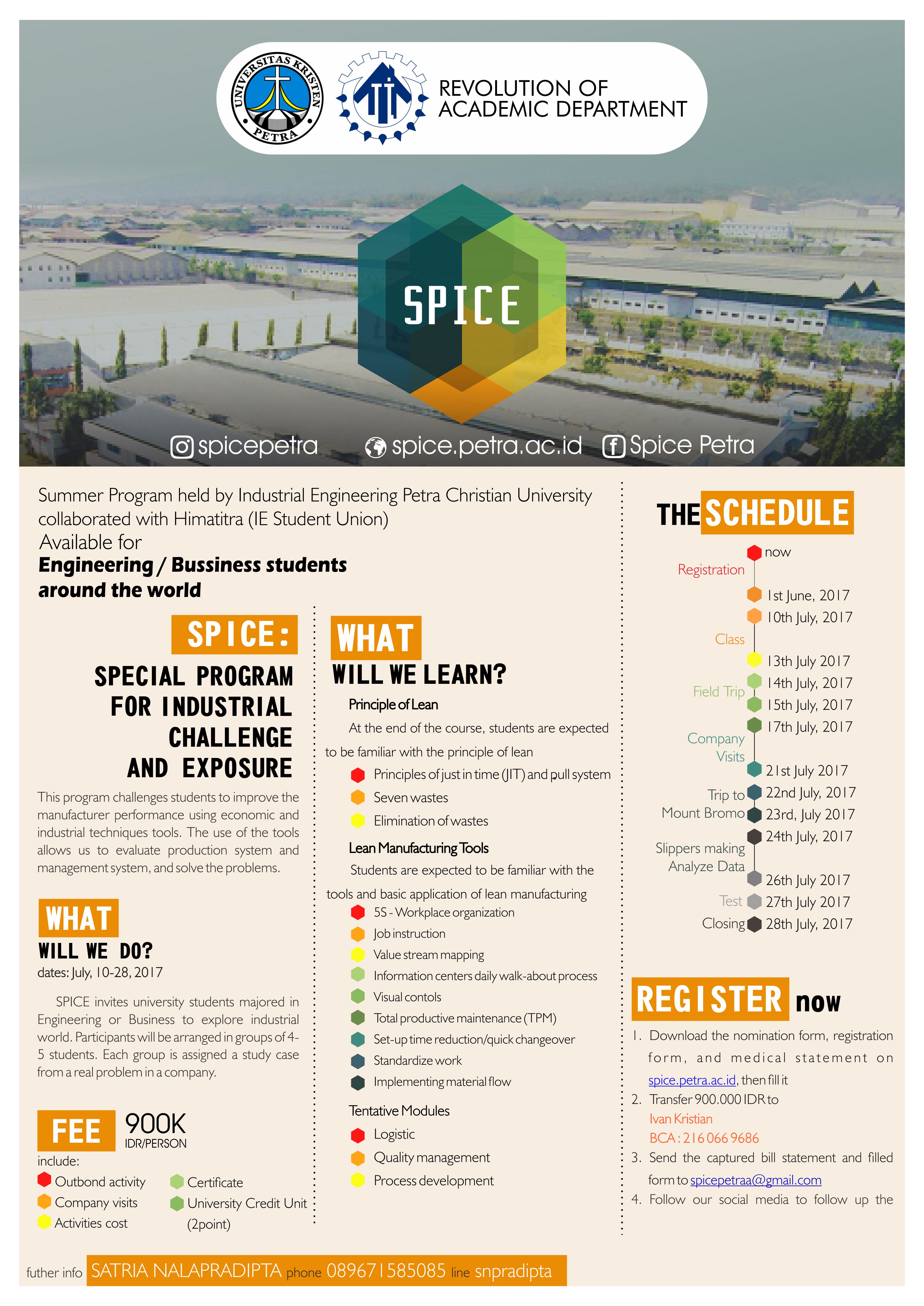 Program Studi Teknik Industri UK Petra lomba yang bertemakan SPICE 2017. Rangkaian acara ini diselenggarakan pada 1 Juni 2017 hingga 28 Juli 2017. Biaya pendaftaran 900.000 per orang.