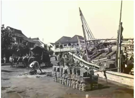 Aktivitas bongkar muatan genting dari kapal kayu di tepian Kali Mas Timur 1928