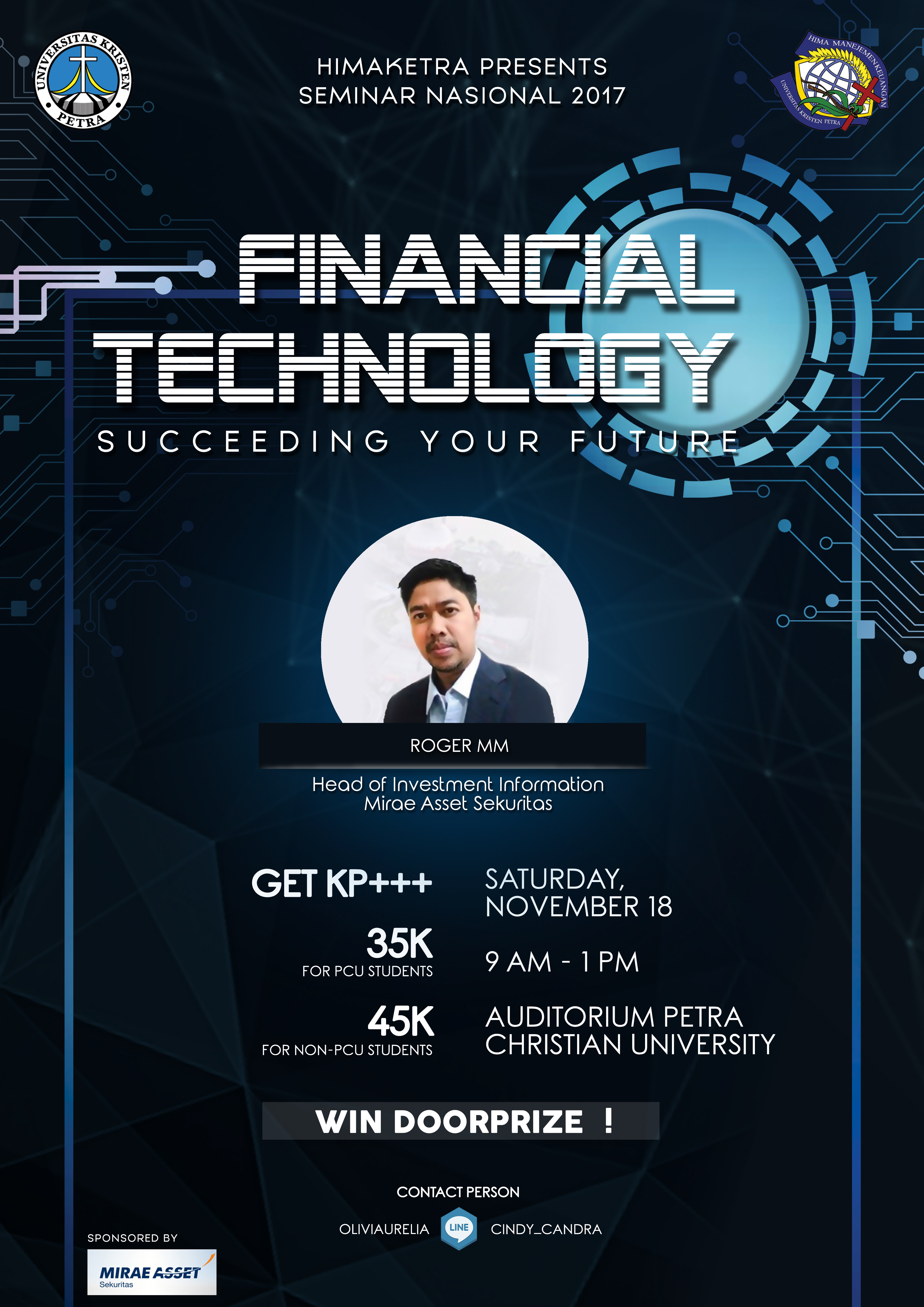 Manajemen Keuangan UK Petra mengadakan seminar nasional dengan tema "Financial technology: succeeding your future". Acara ini diadakan pada 18 November 2017 bertempat di Auditorium UK Petra. Dengan menghadirkan Roger, M.M. sebagai narasumber.