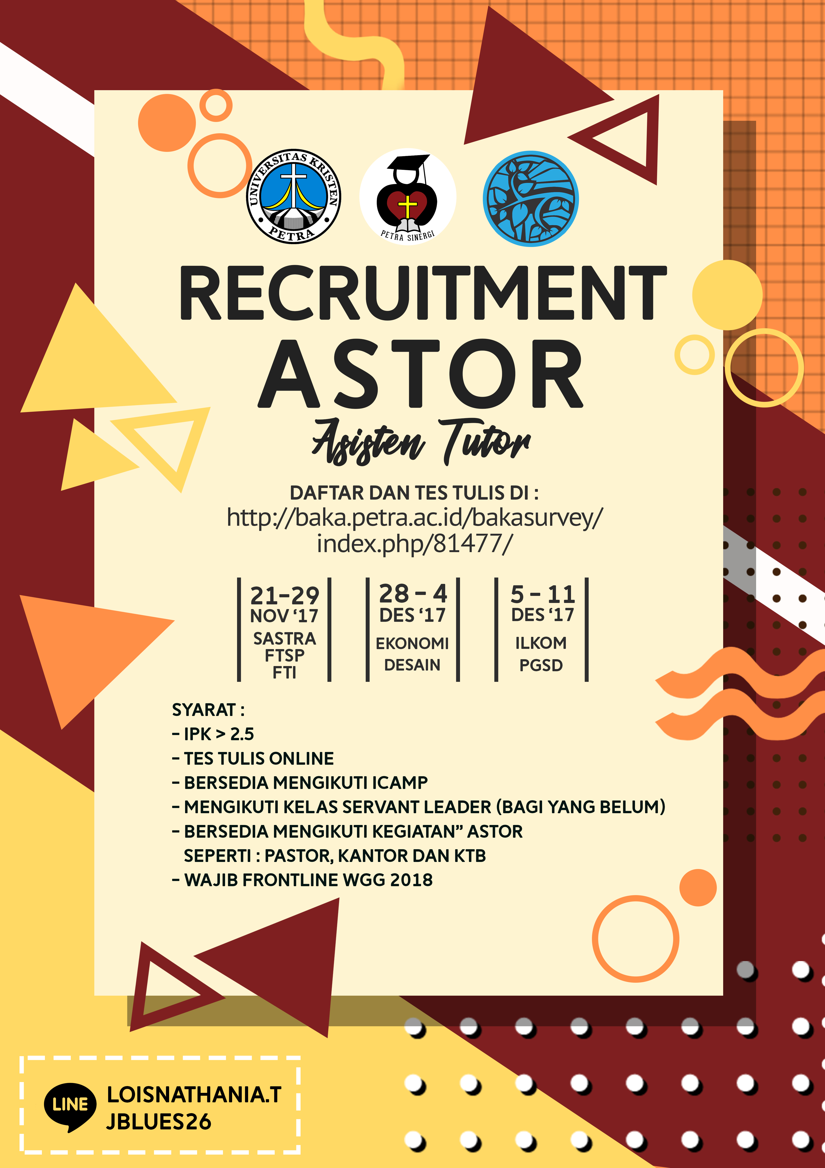 Untuk memperlancar kegiatan diskusi tutorial atau pendampingan bagi mahasiswa baru di kampus UK Petra, maka Departemen Mata Kuliah Umum UK Petra, mengadakan perekrutan asisten tutorial. Bagi mahasiswa yang berminat untuk mendaftar dari tanggal 21 November 2017 hingga 11 Desember 2017.