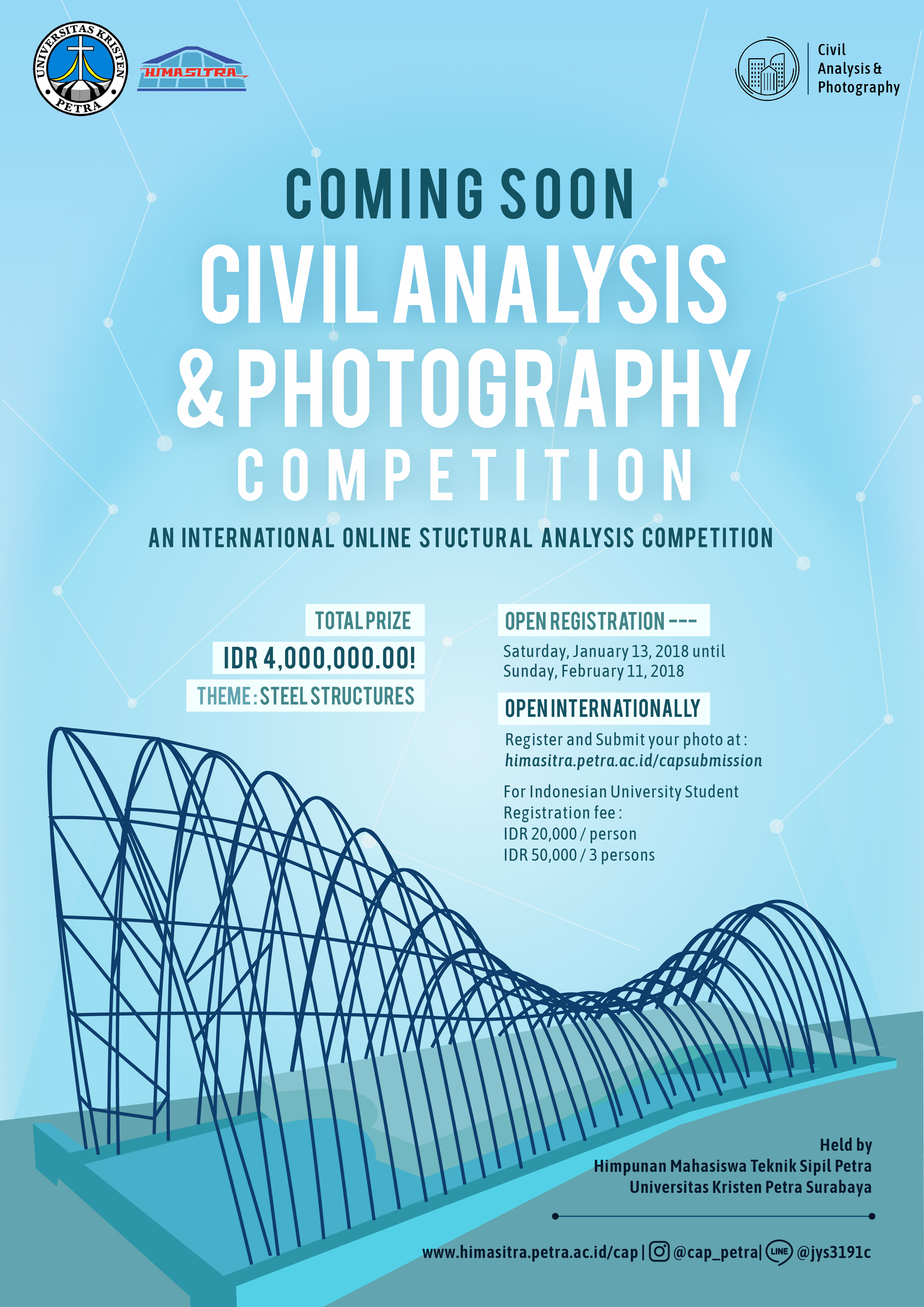 Program Studi Teknik Sipil Universitas Kristen Petra Surabaya mengadakan lomba fotografi tentang teknik sipil. Pendaftaran dibuka pada 13 Januari 2018 hingga 11 Februari 2018. Total hadiah Rp. 4.000.000.
