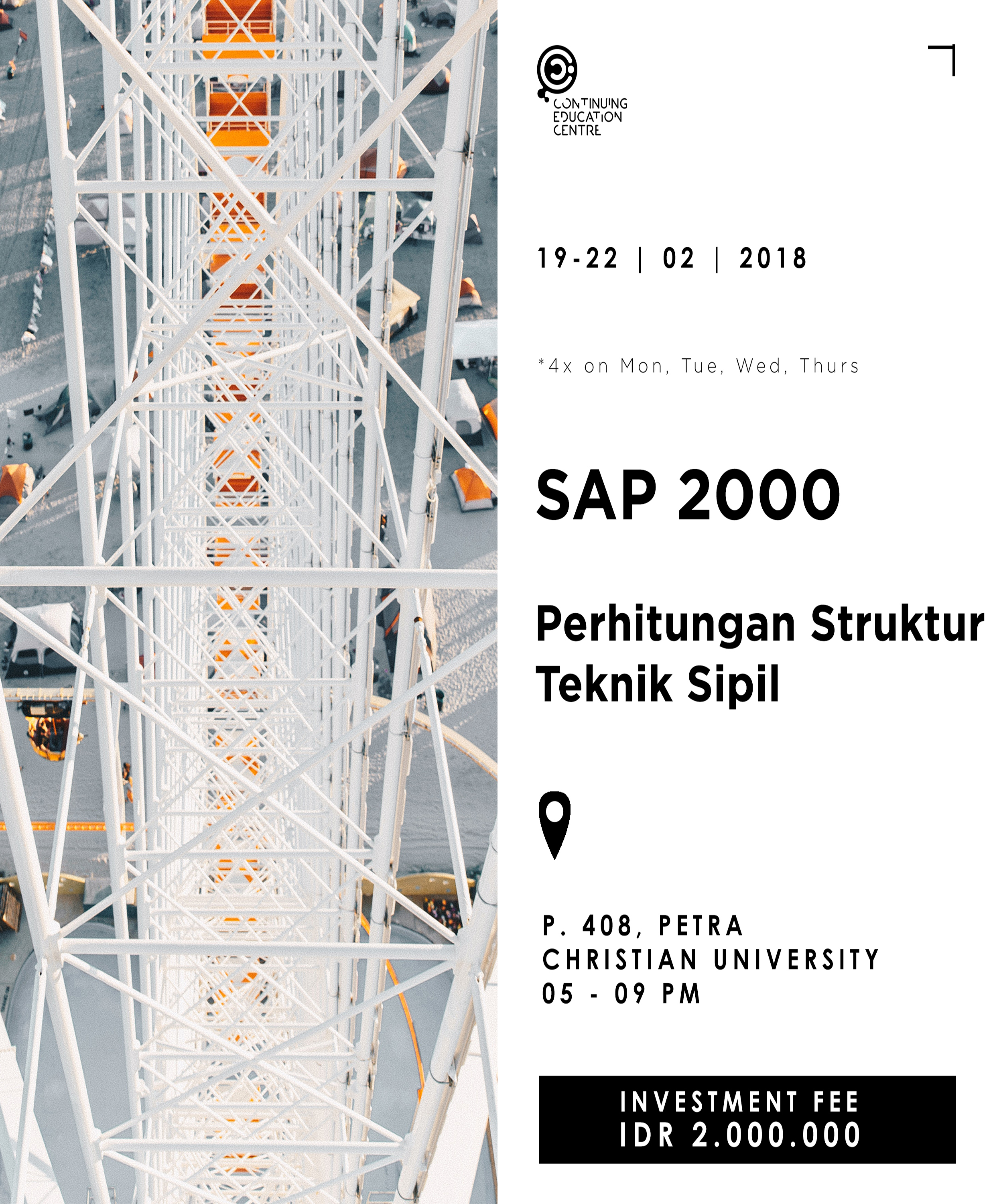 Program Pendidikan Profesional Berkelanjutan Universitas Kristen Petra Surabaya membuka kelas pendidikan profesi. Dengan mengangkat tema Perhitungan Struktur teknhik sipil. Kelas ini akan diadakan pada tanggal 19-22 Februari. Dengan biaya sebesar2 Juta Rupiah.