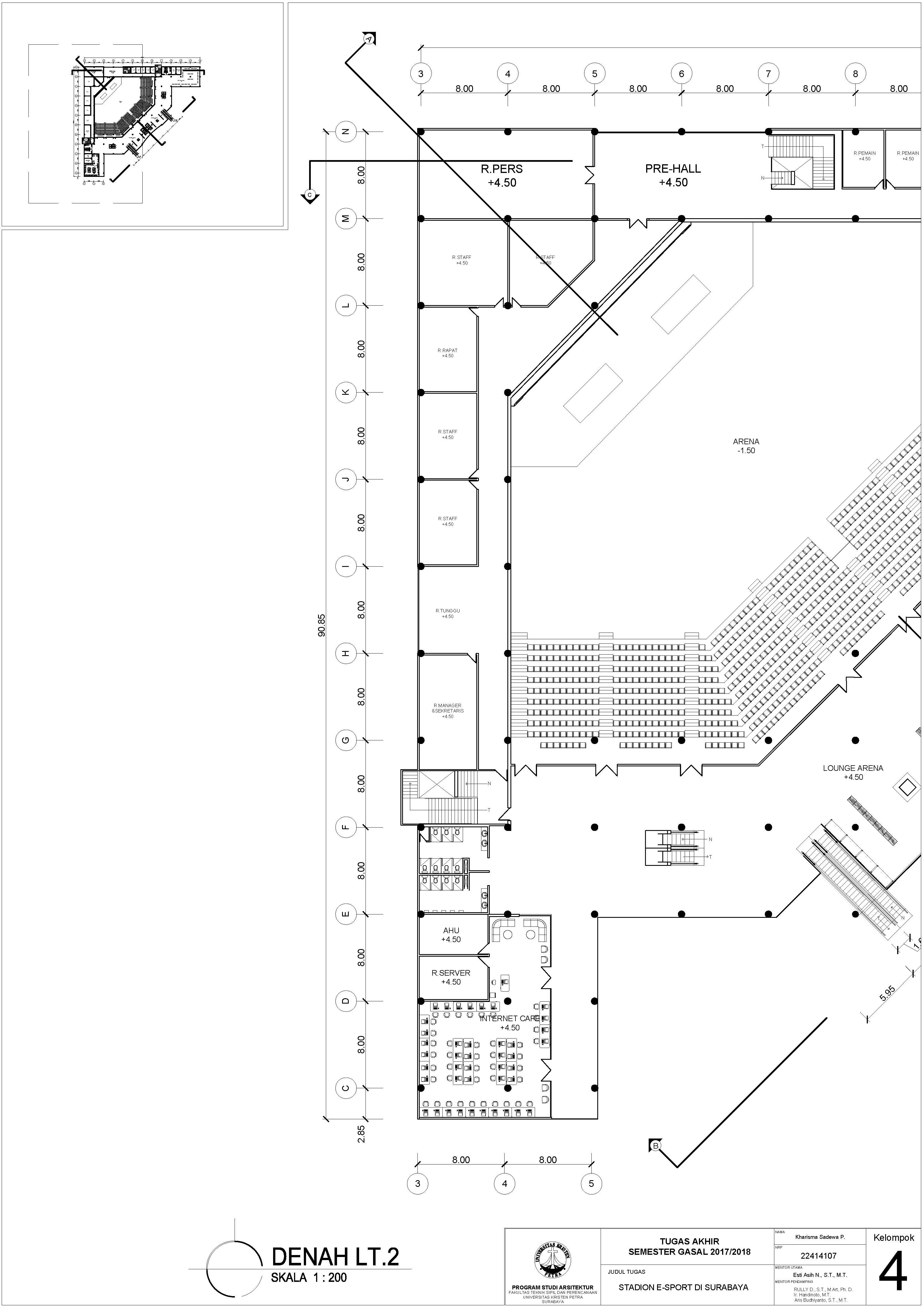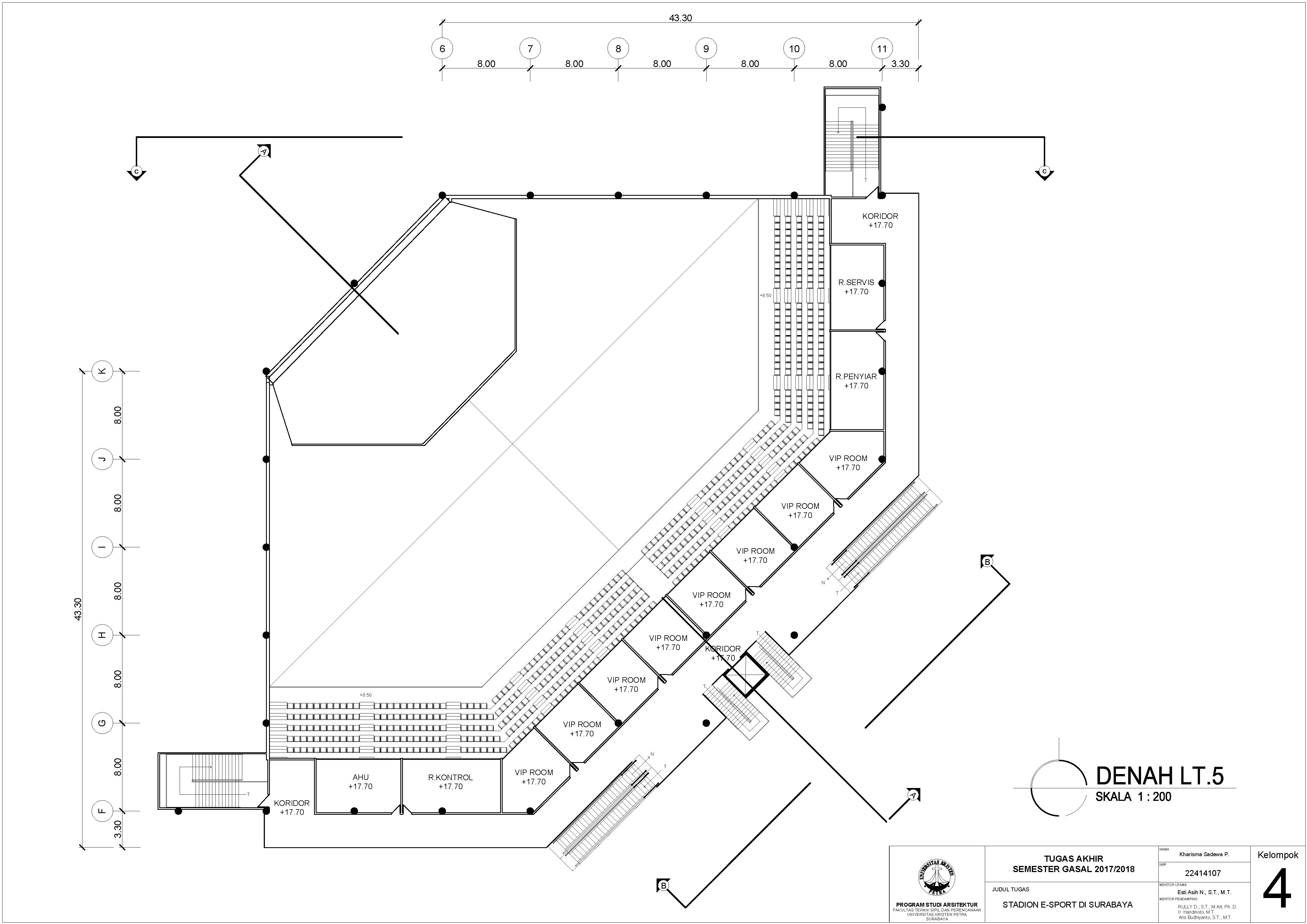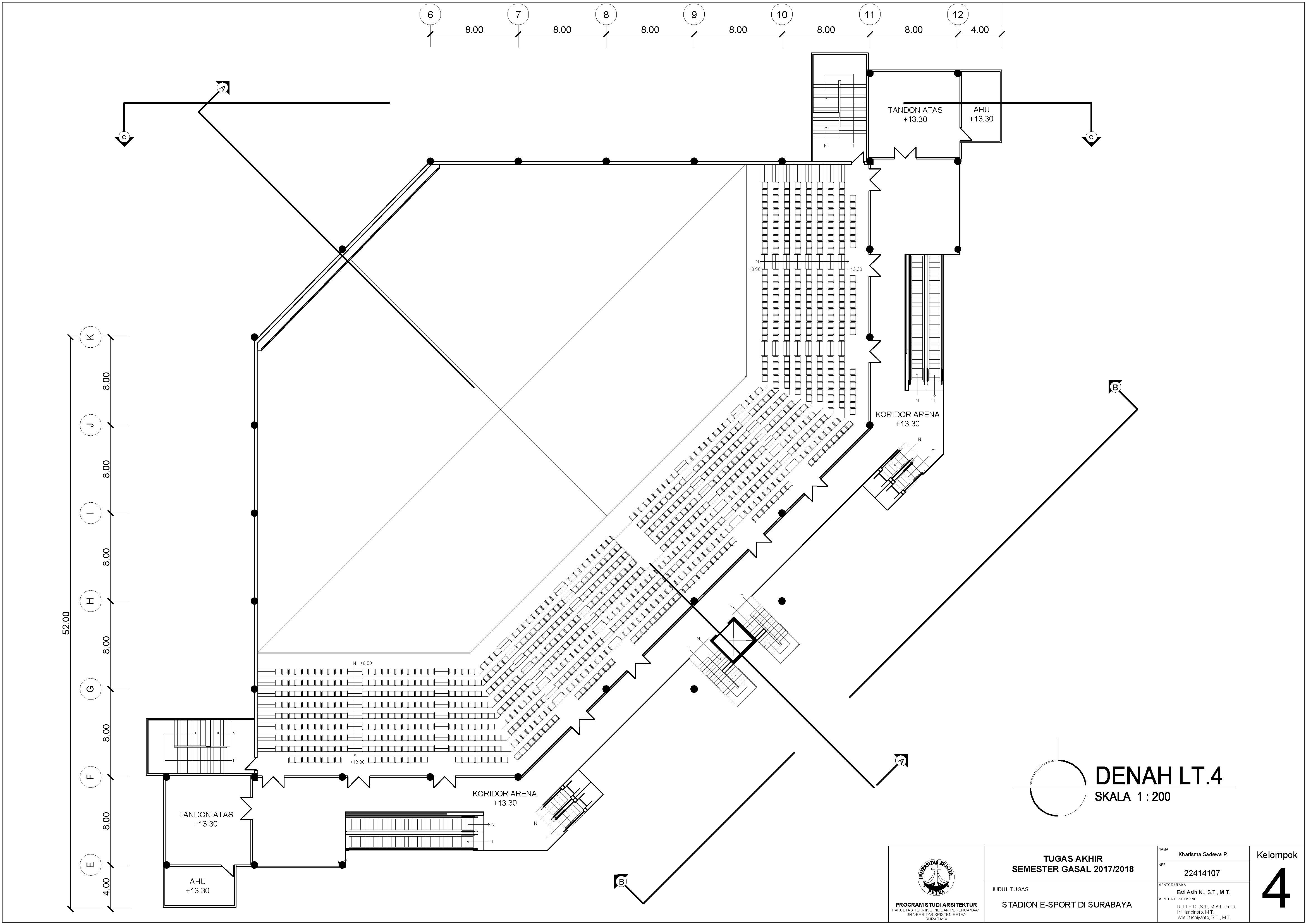 Olahraga elektronik (e-sport) menjadi olahraga kompetitif yang populer sebagai dampak dari evolusi industri game online global. Saat ini, komunitas game online juga mengadakan turnamen dan kontes e-sport yang disponsori oleh perusahaan-perusahaan perangkat game besar. Namun, fasilitas atau tempat untuk menyelenggarakan turnamen yang layak tidak tersedia di Surabaya. Oleh karena itu, tugas akhir ini merancang sebuah stadion yang didedikasikan untuk kegiatan e-sports yang mampu menyelenggarakan turnamen berskala internasional dengan kapasitas 900 kursi penonton, juga dilengkapi dengan fasilitas pendukung seperti food court, internet café untuk bermain game, dan toko perangkat gaming. Roshan, sebagai salah satu karakter dalam permainan DoTA 2, digunakan sebagai signified untuk merancang bentuk dan pelingkup bangunan. Dengan demikian, bangunan ini dirancang untuk memiliki bentuk ikonik yang berasal dari simbolisasi bentukan Roshan. Untuk mengoptimalkan bentuk pelingkup bangunan, proses desain perlu memperhatikan sistem struktur. Oleh karena itu, struktur dirancang menggunakan sistem space truss dan menggunakan pipa baja yang dibuat menyerupai cabang pohon untuk menambah suasana dramatis dalam ruangan.
