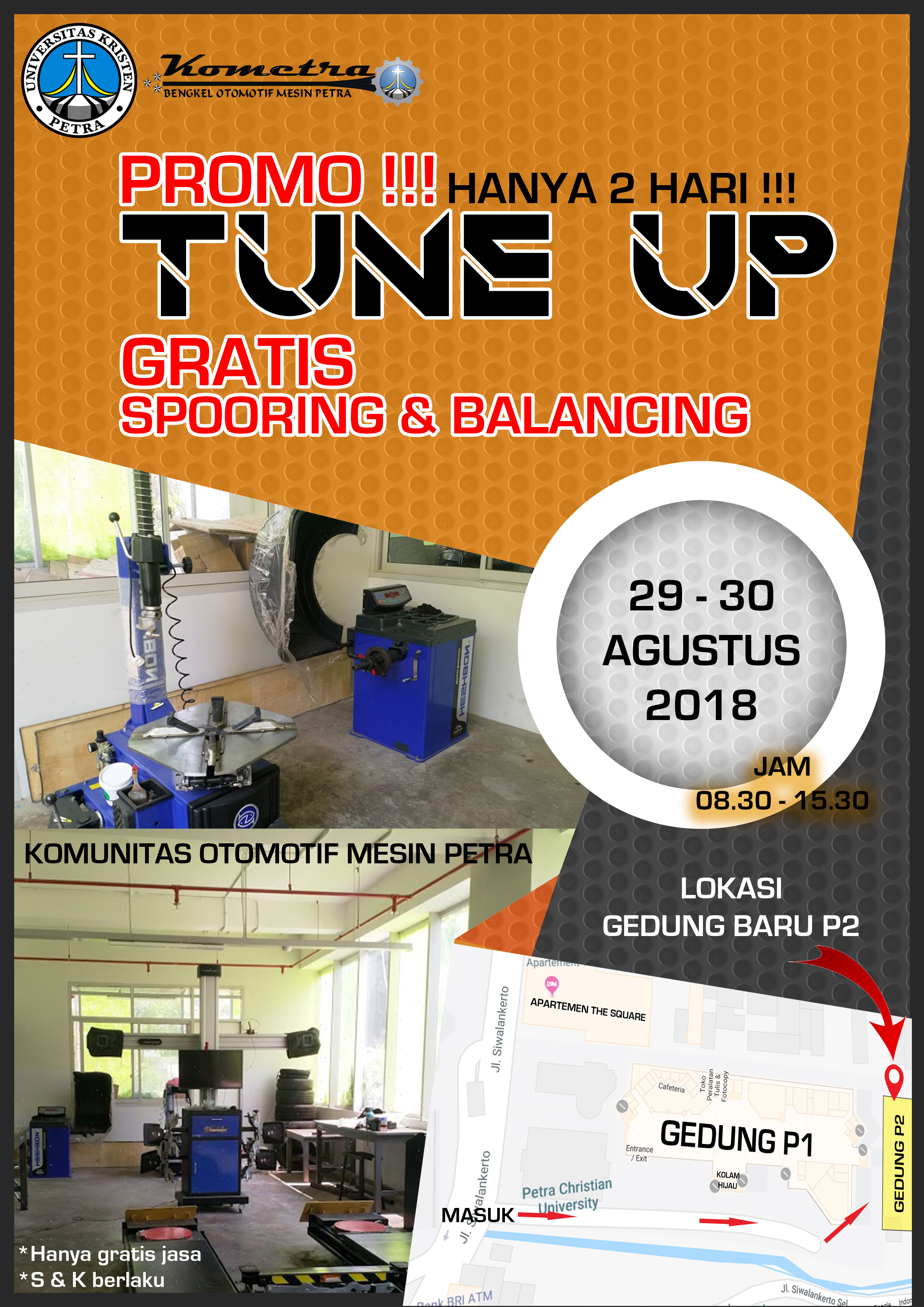 Teknik Mesin Universitas Kristen petra Surabaya pada tanggal 29-30 Agustus 2018 mengadakan kegiatan service gratis, bagi pengguna kendaraan bermotor merk Honda. Kegiatan ini bertempat di gedung P2 kampus timur UK Petra.