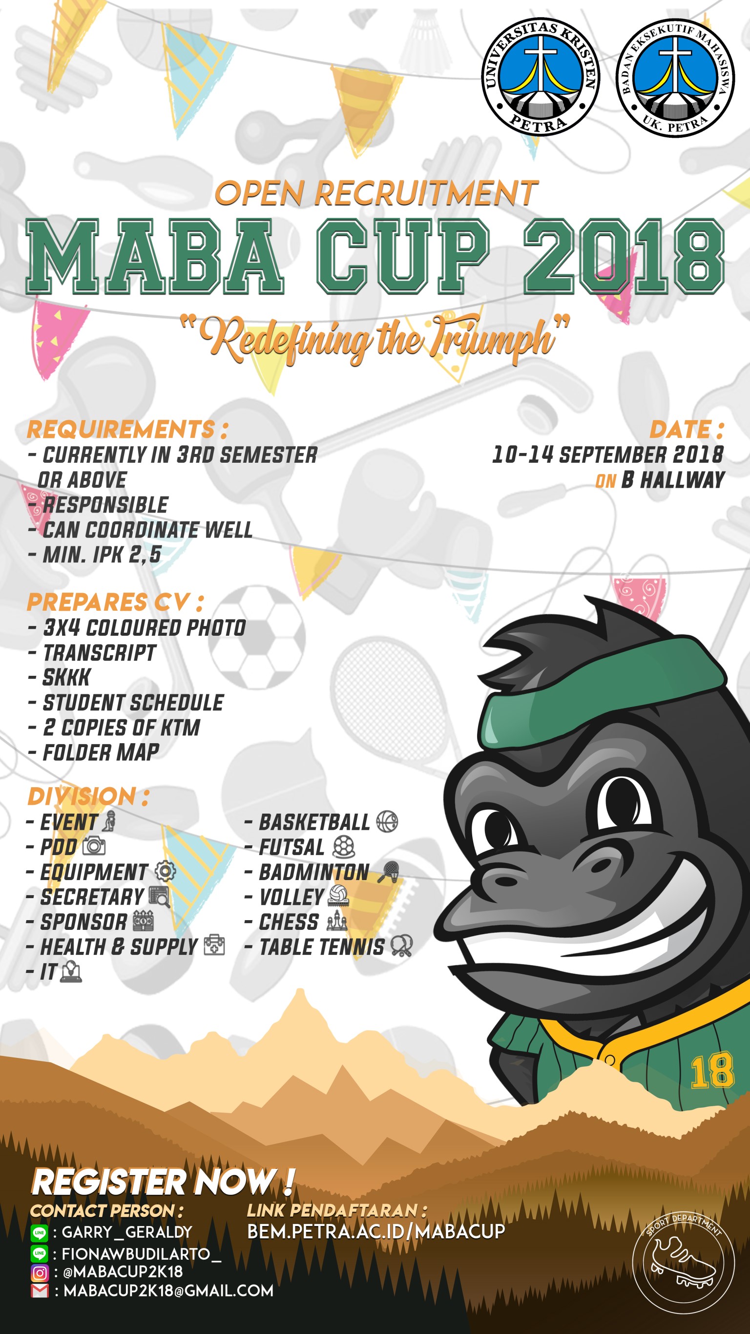 Badan Eksekutif Mahasiswa Universitas Kristen Petra Surabaya membuka kesempatan bagi mahasiswa UK Petra, untuk ambil bagian dalam kepanitiaan Maba Cup 2018. Ada beberapa divisi yang membutuhkan mahasiswa untuk jadi panitia. Pendaftaran di buka pada tanggal 10 - 14 September 2018.